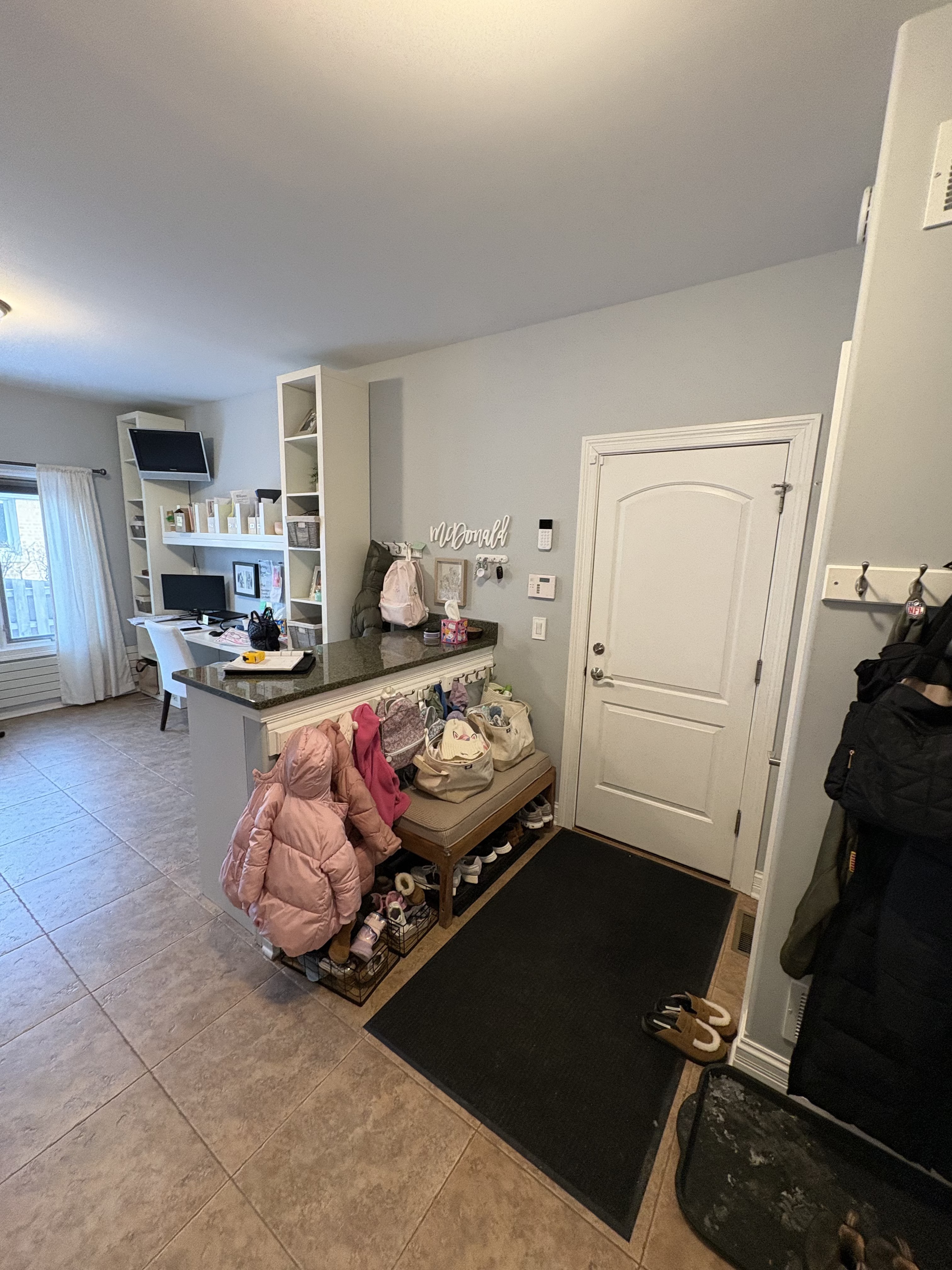 we want the the room to be open on that wall where the desk is and peninsula right to the right of the door we would like 4 mudroom lockers that are sitting on top a stained wood bench with shaker style drawers on the bottom and shaker style doors on each of the lockers and open cubbies on the top on the same wall as the four lockers on the wall incorporate a desk area in that space along that wall the desk will have a matching wood top to the lockers with 2 sets of 3 drawer cabinets for desk also two floating wood shelves above the desk remove floor mat