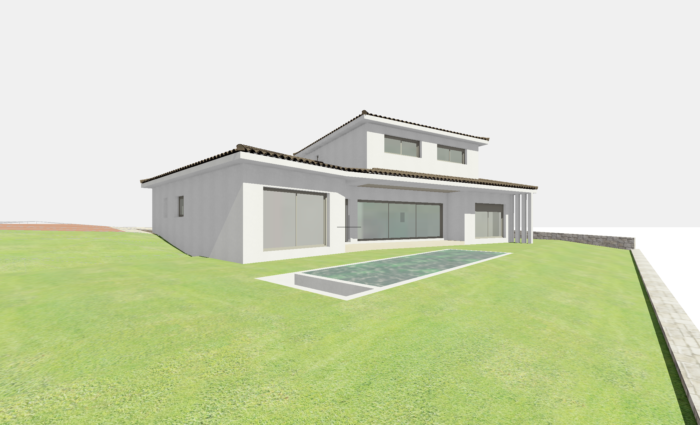 mediterranean landscape in the backgound lot of light and reflects in the windows add some mediterranean pine trees and olive trees more sun on the facade