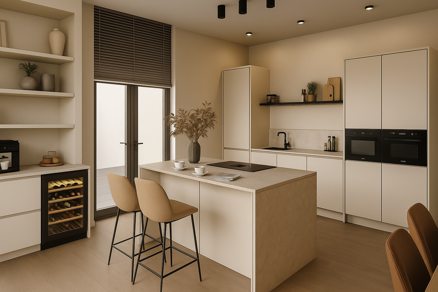 modern living and dining bright and vibrant natural light beach themed colors with dry stone cladding around fireplace and tv hanging on wall timber joinery with timber bench tops timber panel ceiling lining and burnished concrete floors outlook onto front garden and lawn with large gum trees and foreshore lots of natural light follow geometry of original image but make the output image ultra realistic