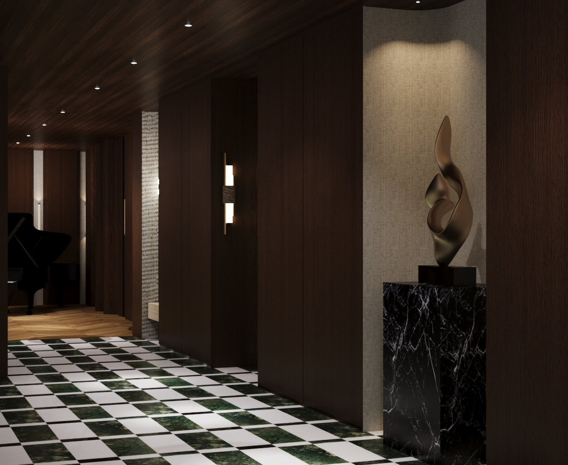 improve materials texture make it realistic but keep colors tones and patterns the same add realistic fabric texture to white chair with realistic scale make the image photorealistic high resolution keep all elements and colors the same keep image environment at night time keep same lighting keep same camera distance avoid zoom in keep same camera angle calm ambient luxury feel maintain same wooden color as reference image improve materials texture make it realistic but keep colors tones and patterns the same keep image environment at night time keep same lighting don t make environment too dark no glare around wall lights make the piano black maintain curves in concave wall niche as reference
