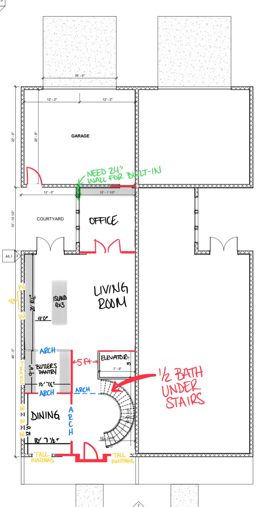 create foorplan based on this with luxury organic modern interior makee the bqack room a garage and increase depth to 24 show 2 cars parked in back room in front room oposite stairs make a dining room