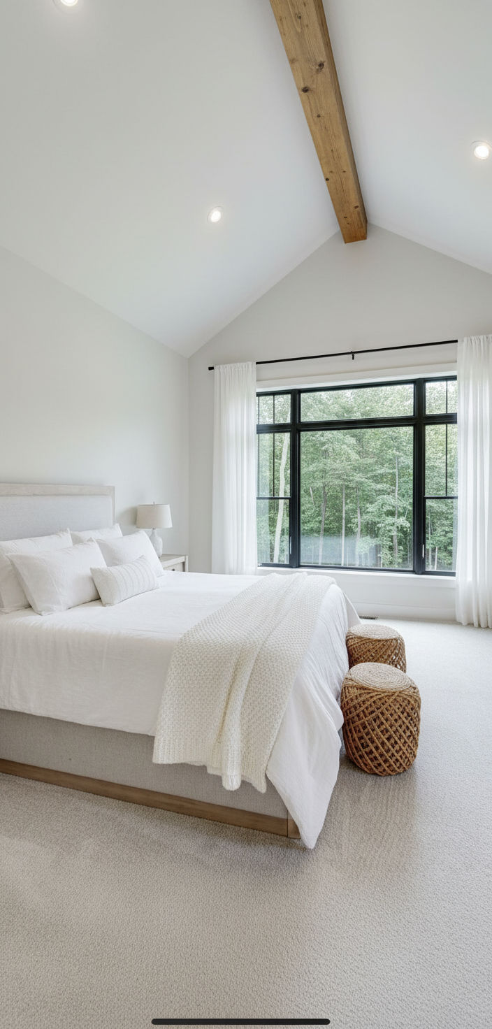 change the walls to a very light gray with lavender undertones change the chandelier to champagne and crystal and make it come down from the beam on the ceiling make the chandelier bigger make the bed frame and nightstands white make the bedding light lavender and white decorate the room for a teen girl put white framed pictures of purple flowers above the bed