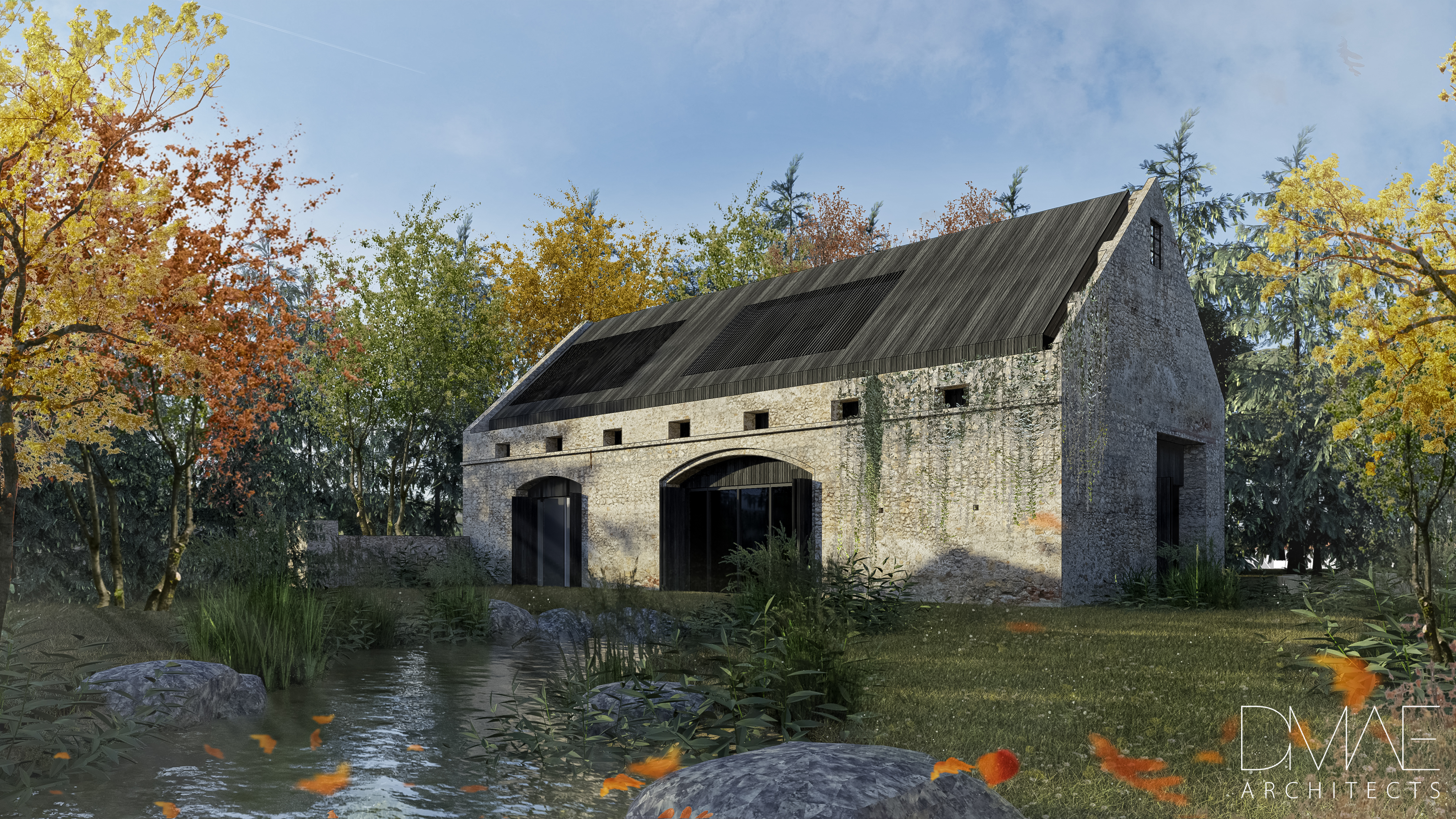 exterior shot keep the barn and make the materials more realistic softer light more wild grass