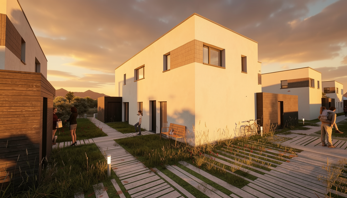make as photorealistic as possible while keeping textures the same as selection professional landscaping in a suburb of columbus oh with good lighting match materials to plan and remove any text siding ebe8db trim ebe8db soffit and fascia white windows black 3 4 glass 6 lite front door white roof moire black certainteed square posts as shown 683c22 11am