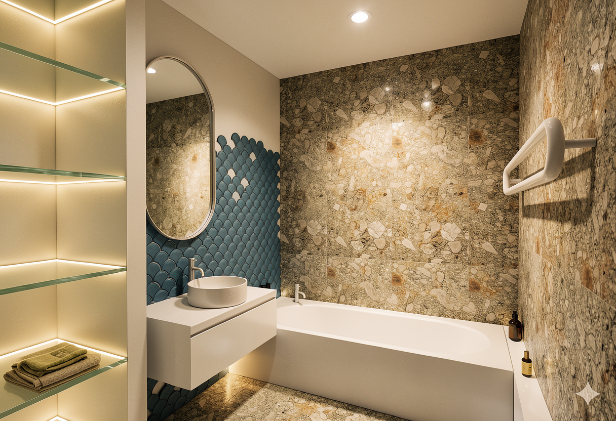 render senyata mungkin tambah indirect light di plafon yang tengah dan dalam lemari lemari dengan kaca coklat tembus lantai harringbone vinyl krim jangan ubah bentuk dan warna material yang lain ambien cahaynya off white
