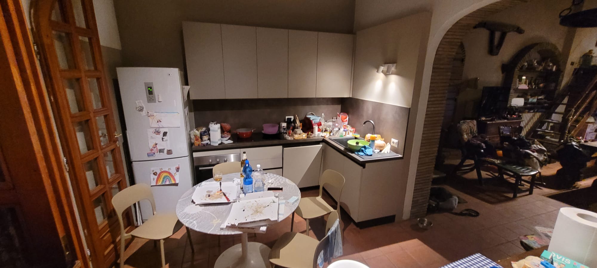 rimuovi tutti gli arredamenti interni presenti e sostituiscili con una cucina moderna con penisola e con molti accessori