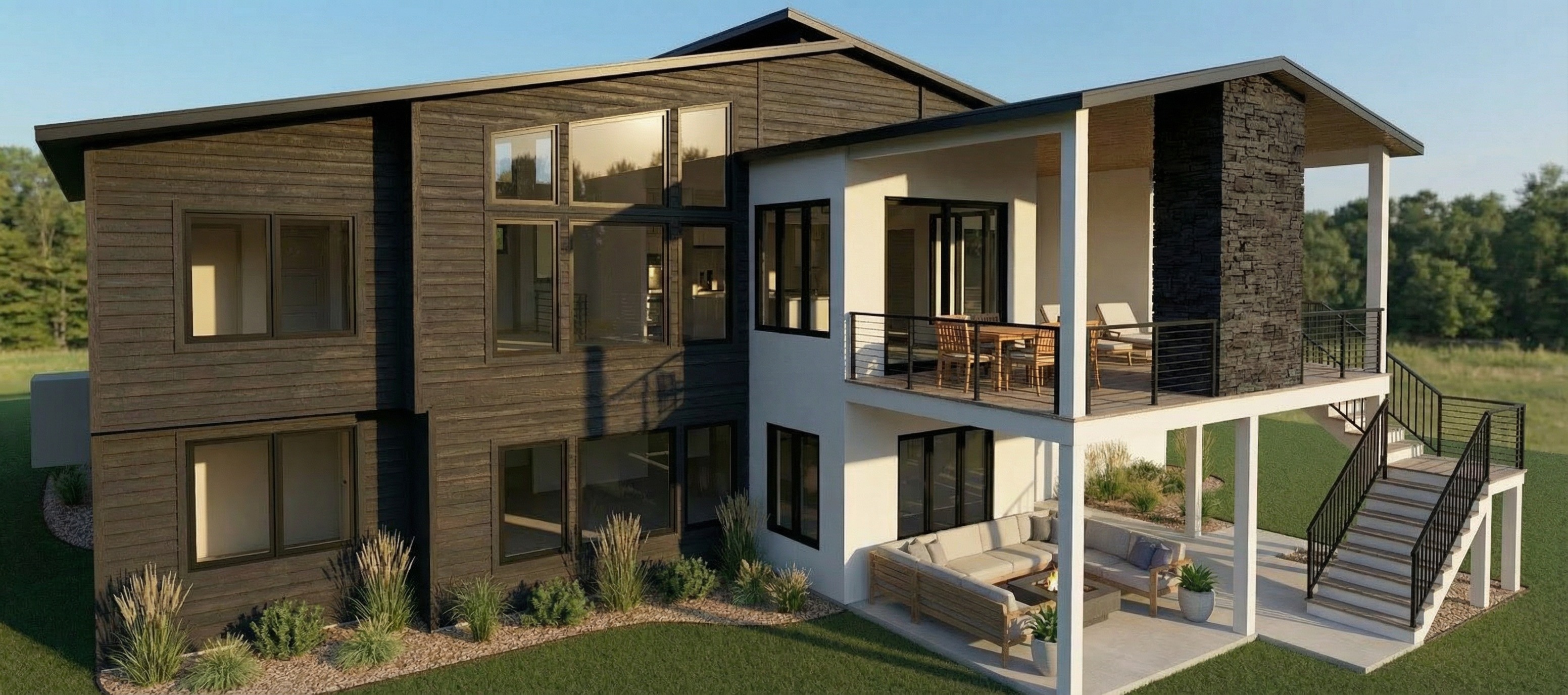 change only the white stucco wall inside the recessed deck area behind the railing to black horizontal siding matching the rest of the house keep the bumped out tower volume and lower patio structure as white stucco do not change geometry lighting or any other materials