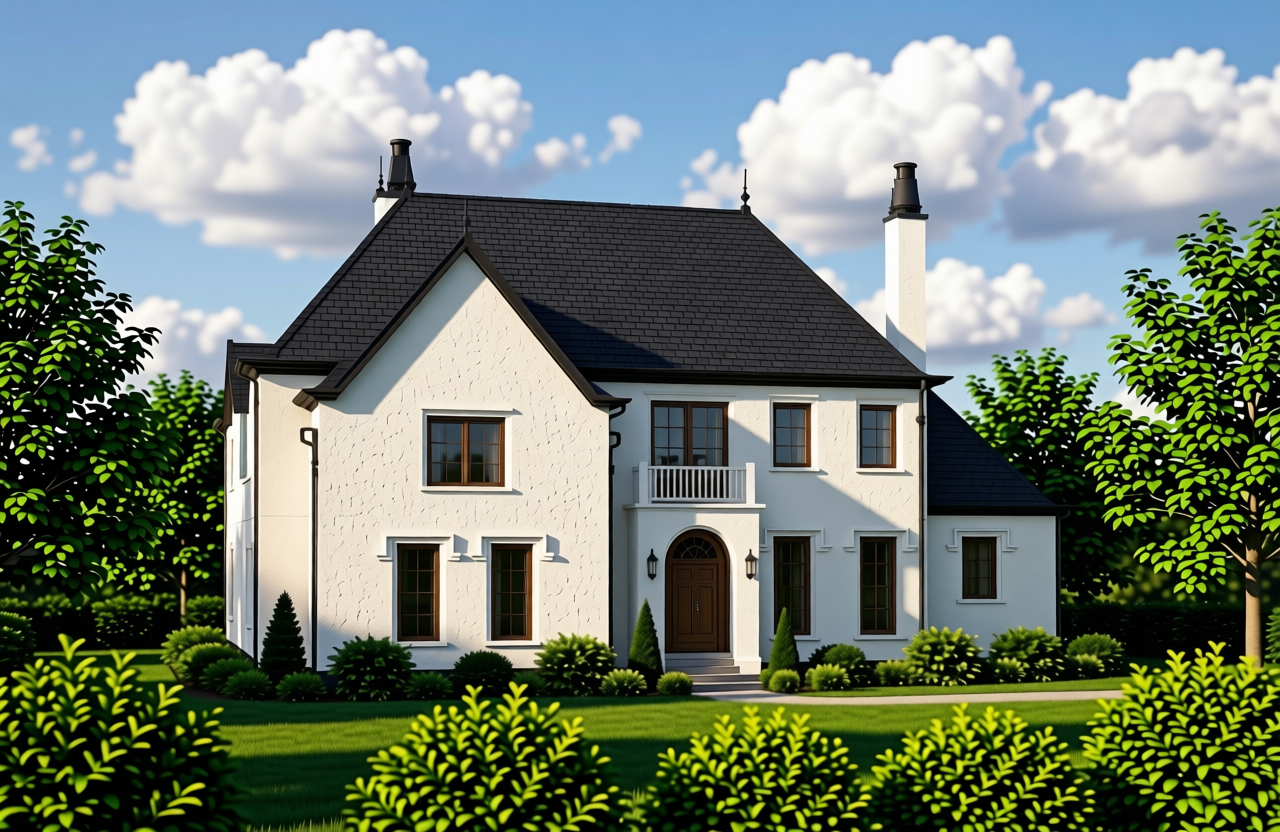 brick to be white copper gutters and downspouts black shingles blue sky with clouds add trees at the back eaves and rake to be white remove front roofs