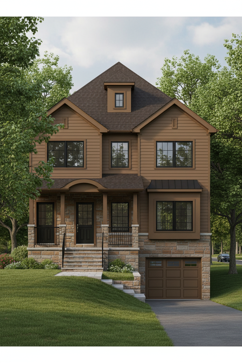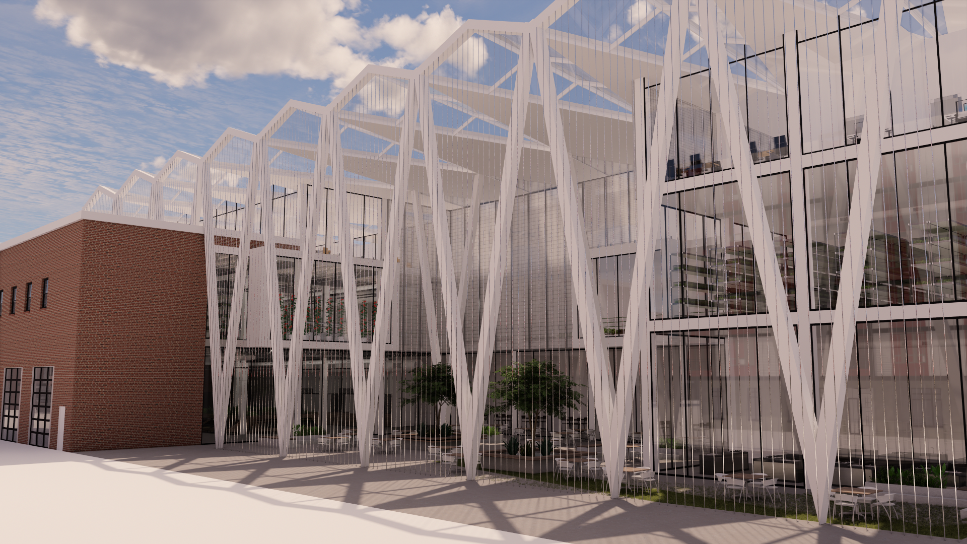 keep the architecture exactly the same increase the amount of greenery only on the thin vertical steel cables add more vines on every cable so the coverage is denser from top to bottom the vines should stay narrow vertical and attached strictly to each cable no greenery on the diagonal v frames or glass no planter boxes or landscape changes maintain the same vine style as before just increase the quantity and density across the entire cable plane including the upper cables above the brick volume