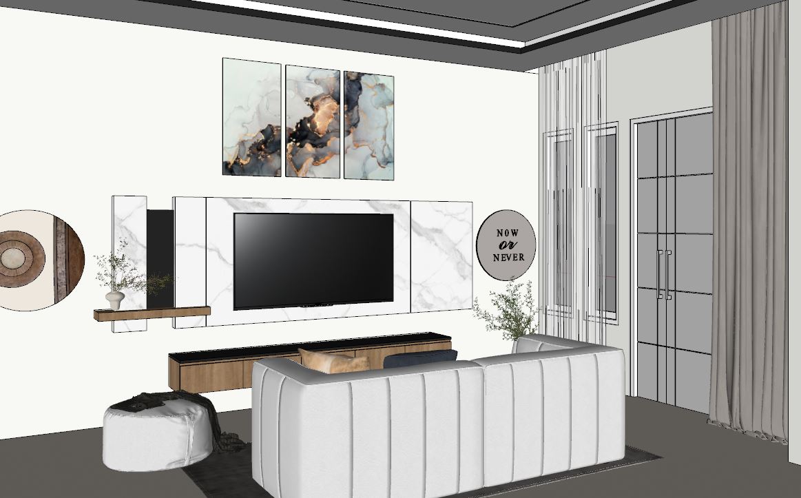 buat gambar ultra realistis tanpa mengubah struktur bentuk desain atau material apa pun jangan mengubah ukuran jpeg lantai menggunakan keramik polos glossy warna beige dinding warna off white dan plafond warna putih tambah lampu spot light di plafond dan tambah lampu indirect light ke curtain valance dan drop ceiling pintu warna abu terang dengan kusen putih dan jangan ubah material warna dan bentuk