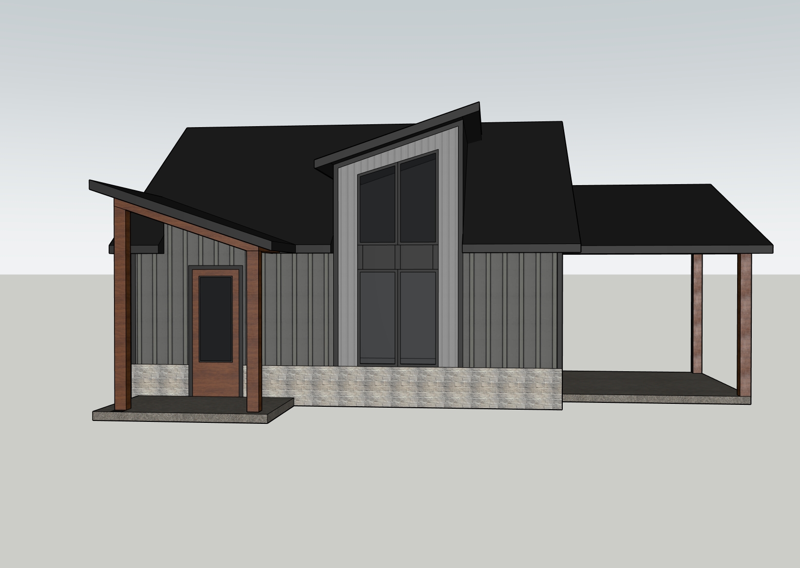 modern style add landscaping add wooded lot black metal roofing make realistic tall section to be bright silver metal paneling the rest of the siding to be dark grey board and batt