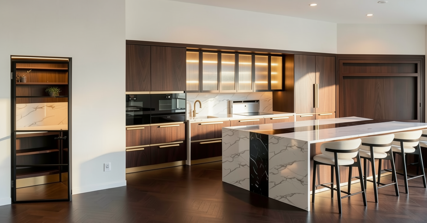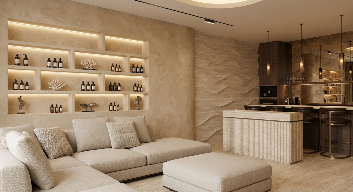 create a cohesive interior design mood board based on this bathroom image extract the color palette materials textures and overall style include elements such as tiles fabrics wood samples lighting fixtures and decor pieces arrange them in a clean aesthetic layout with a modern editorial style soft lighting high end interior design presentation neutral background minimal and elegant composition change the blue iles to brown aesthetics