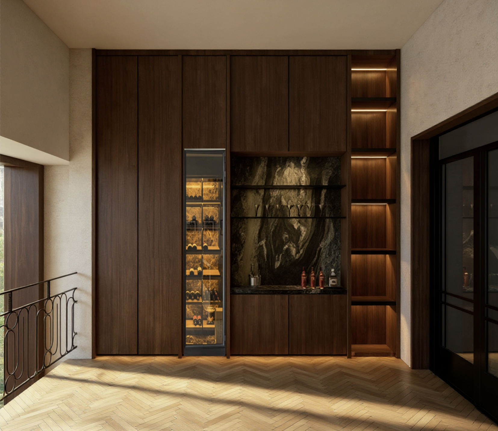 het huidige ontwerp moet volledig behouden blijven geen wijzigingen aan vorm materialen of kleuren graag enkel een realistischere render van de bestaande sc ne met verbeterde belichting schaduwen en textuurdetails zodat het geheel natuurlijker en levensechter oogt voeg onder elk bronzen schap subtiele led verlichting toe die het marmer op de achterwand mooi en gelijkmatig uitlicht inclusief de kleine schabben aan de rechterzijde
