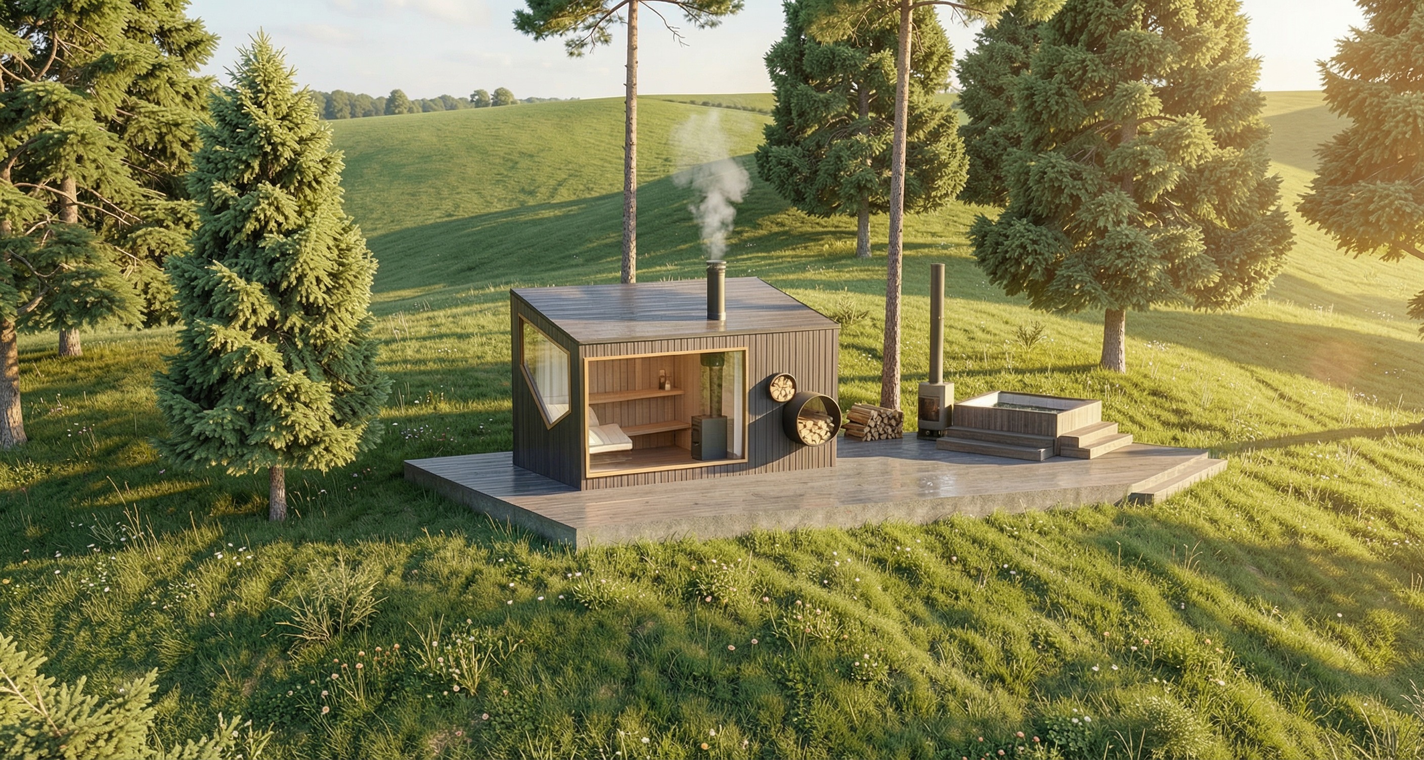 render a photorealistic 3d perspective of this sauna the current material style keep model geometry the same windows doors roof sky with light atmospheric depth render in hyper realistic architectural visualization quality 8k resolution