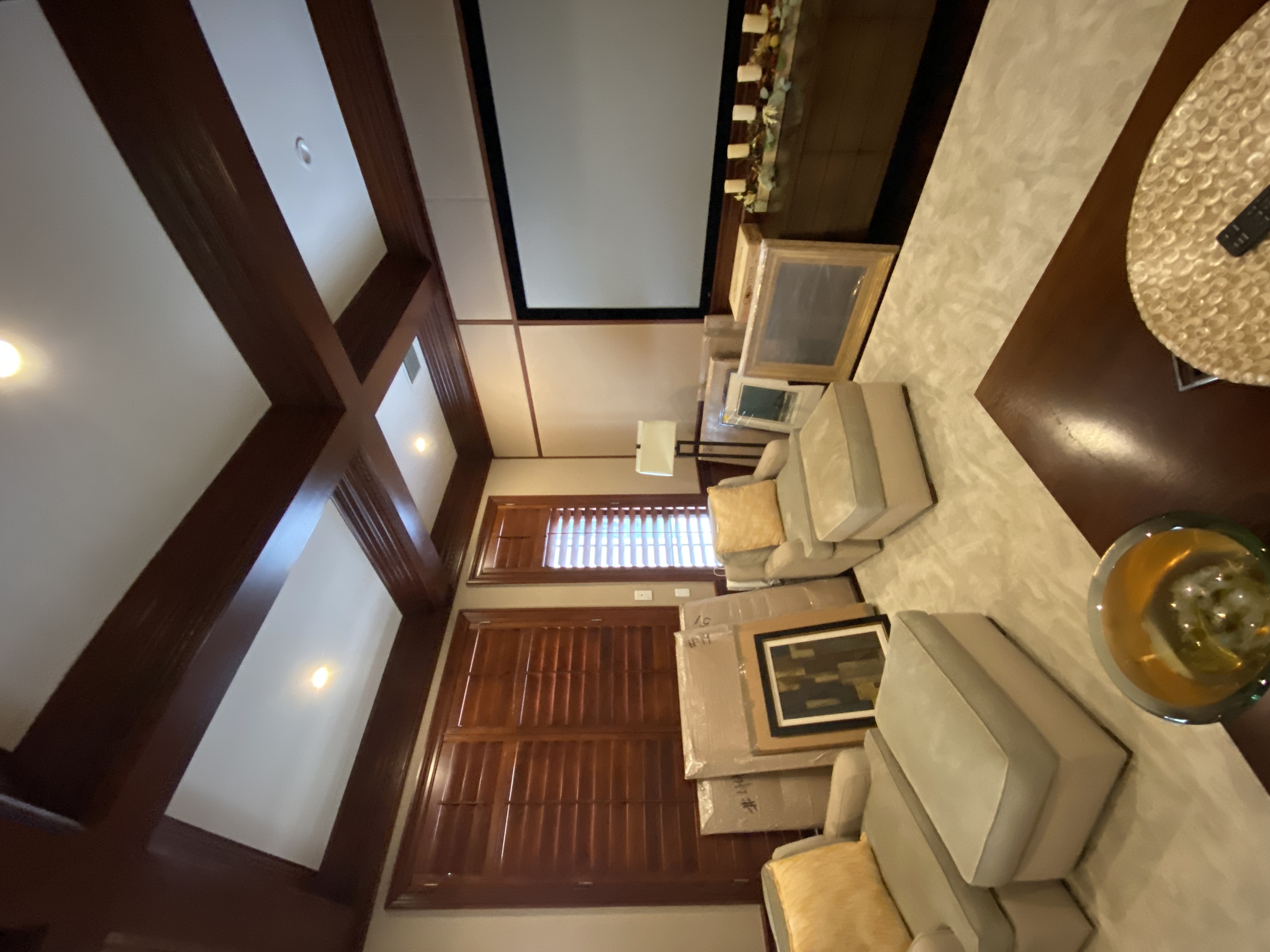 turn this club room into stained white oak with board and batten