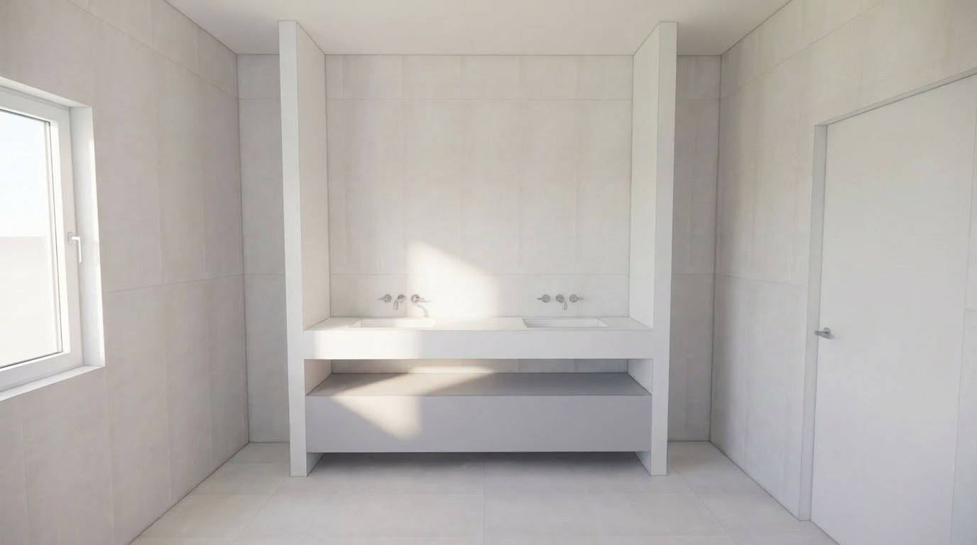 keep everything exactly the same in the rendering do not change the layout walls doors windows shower niche plumbing fixtures wall tile lighting vanity or any materials only change the size and scale of the floor tile the floor tile should be the same exact material and color but the tile size should be changed to large format rectangular tiles approximately 16 x 32 reduce the number of grout lines so the tiles appear larger keep the tile layout straight do not change the tile material color layout direction or anything else only change the grain if the tiles to be going vertical for the wall and floor tiles keep the color and size and scale the exact same do not add anything else keep everything else exactly the same do not add anything else make the final image look like a realistic photo rendering with natural lighting and soft shadows