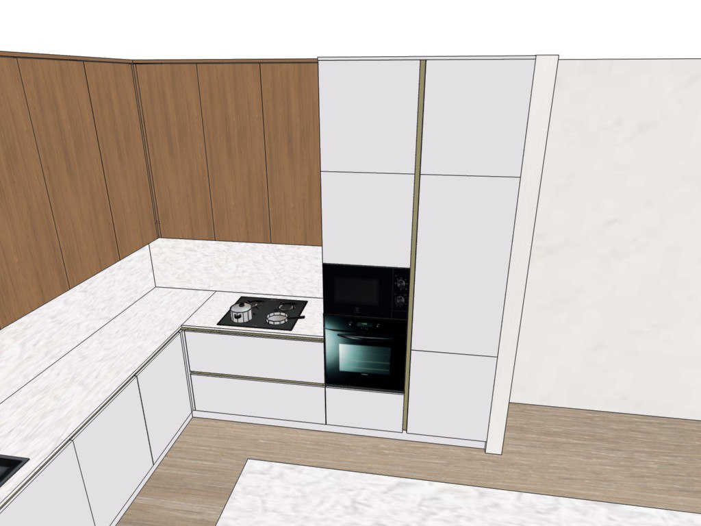 kitchen interior with a modern minimalist design use a snoji white sw color the walls countertop should be porcelain grey beige slight structured the kitchen should feature mate cashmire cabinetry and upper cabinets should be egger oak brown casella the oven and stovetop are sleek and contemporary in a reflective black finish the flooring is a warm neutral light oak wood enhancing the cozy atmosphere the atmosphere is clean modern and welcoming