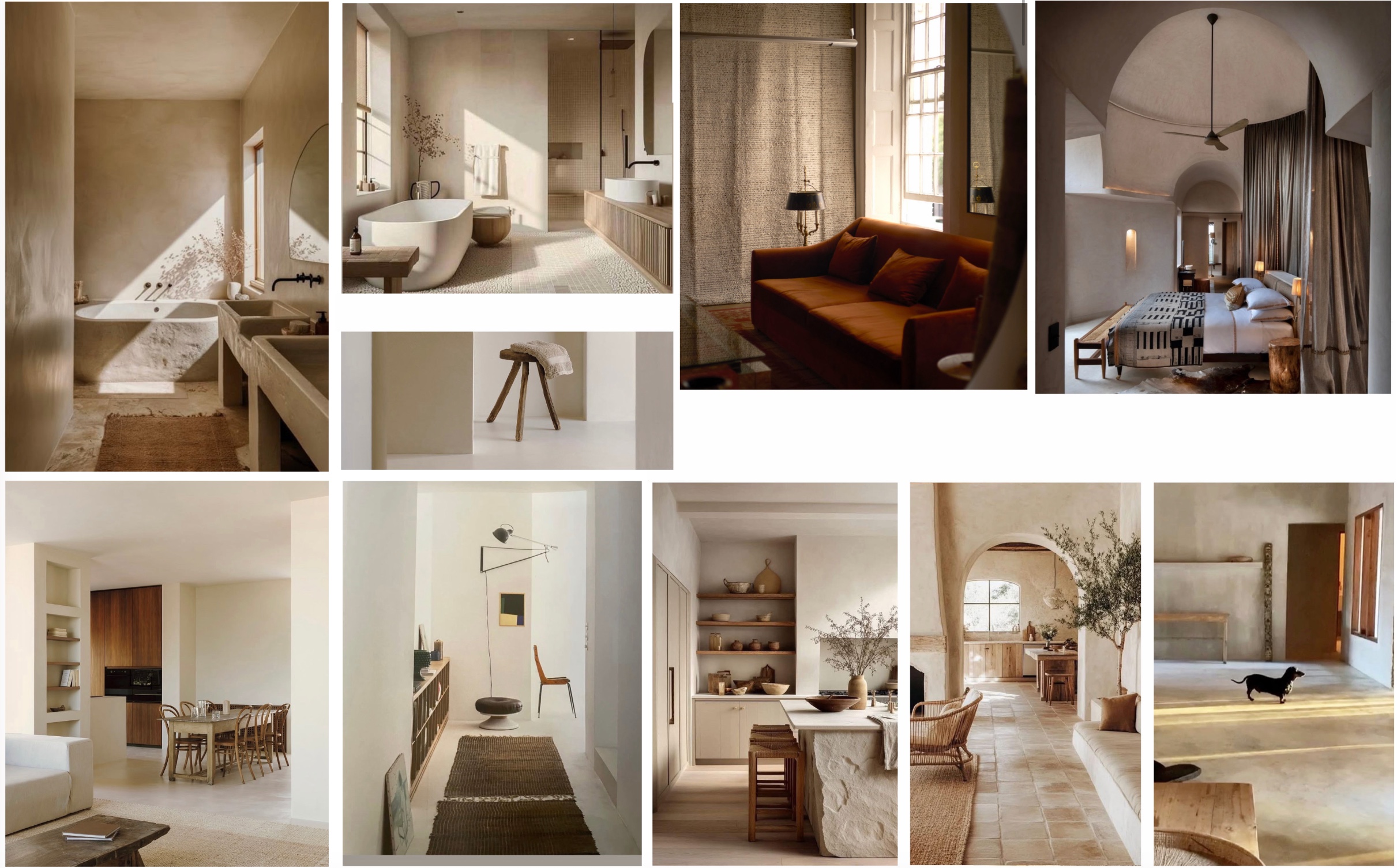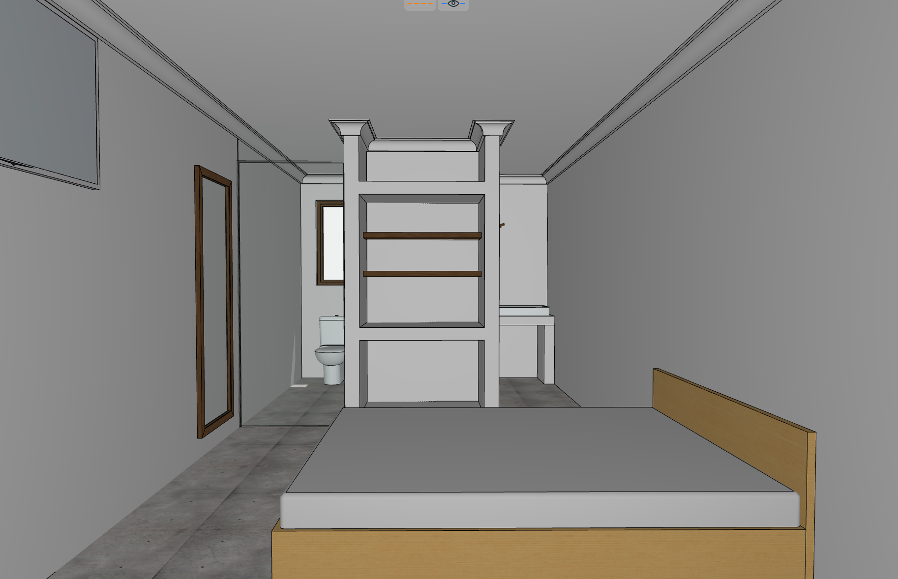 exterior shot create an interior render of thus room in muted natural colors with walls and of a natural warm cemcrete finish with white linen bedding and throw on the end with tracklights on the low ceiling the glass door to the wc to be reeded glass and all timber to be natural teak