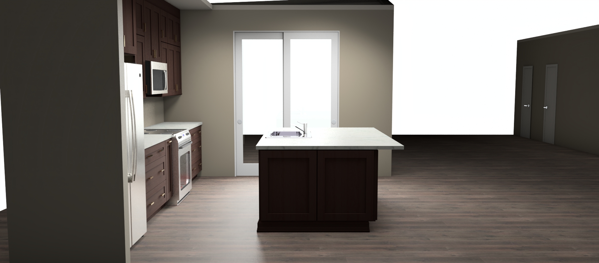 create a realistic image from this kitchen rendering the cabinet should be a rustic hickory in a warm brown finish with luce oro countertops subway tile backsplash
