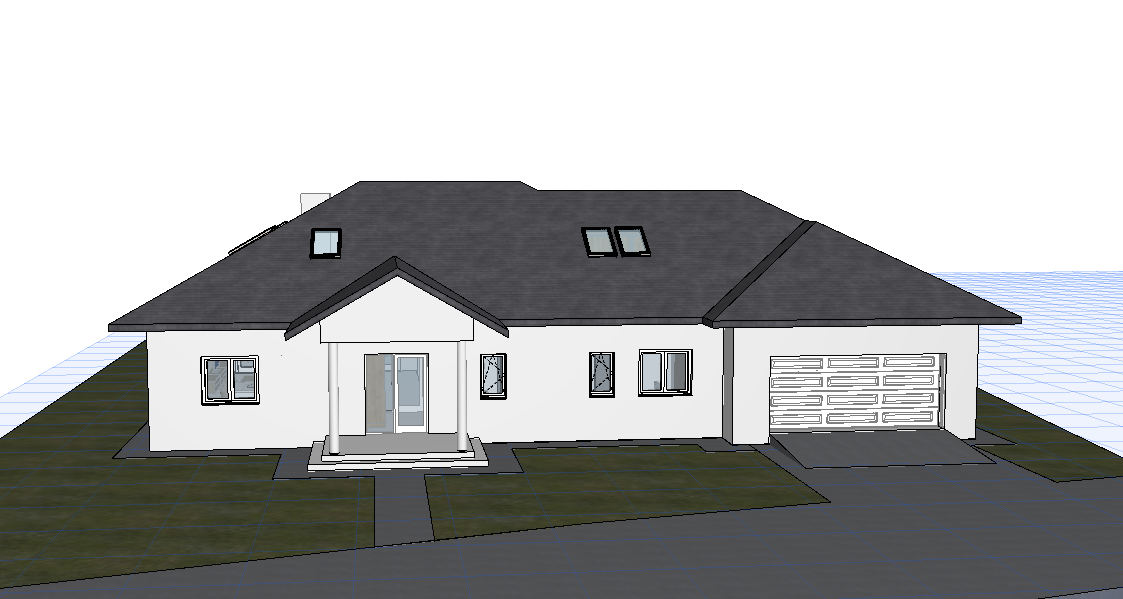 photorealistic render of an american style modern house with a white exterior facade clean architectural lines and a symmetrical design the house features large windows with black frames a covered front porch with columns and a pitched roof surrounded by lush greenery including a manicured lawn decorative shrubs and mature trees bright natural daylight soft realistic shadows ultra detailed textures high dynamic range lighting 4k resolution professional architectural visualization highly realistic materials