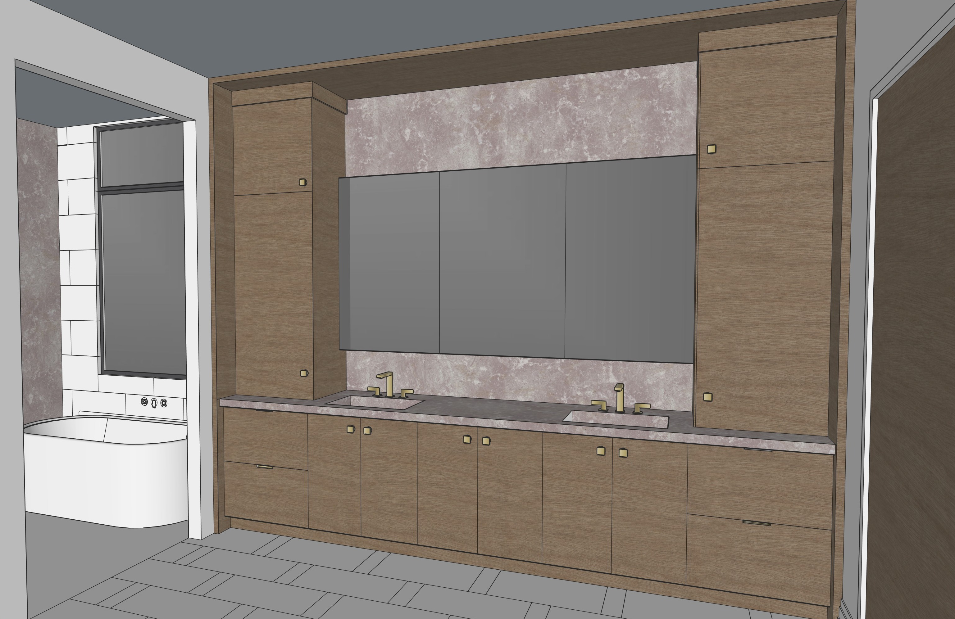 mirror panels in middle with uplight and downlight behind mirror washing on mirror brass knobs and pulls view into shower with free standing tum and tub water controls in brass on wall view through window looking at lake in the distance great down lighting in ceiling tile on floor and shower floor matches tile on shower walls frameless glass door to shower with brushed brass towel bar in glass and brushed brass handle on glass shower door use stone reference image for stone backsplash and counter and wood reference image for cabinetry color