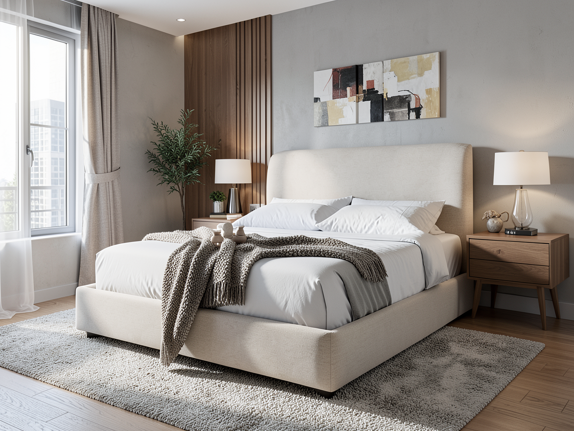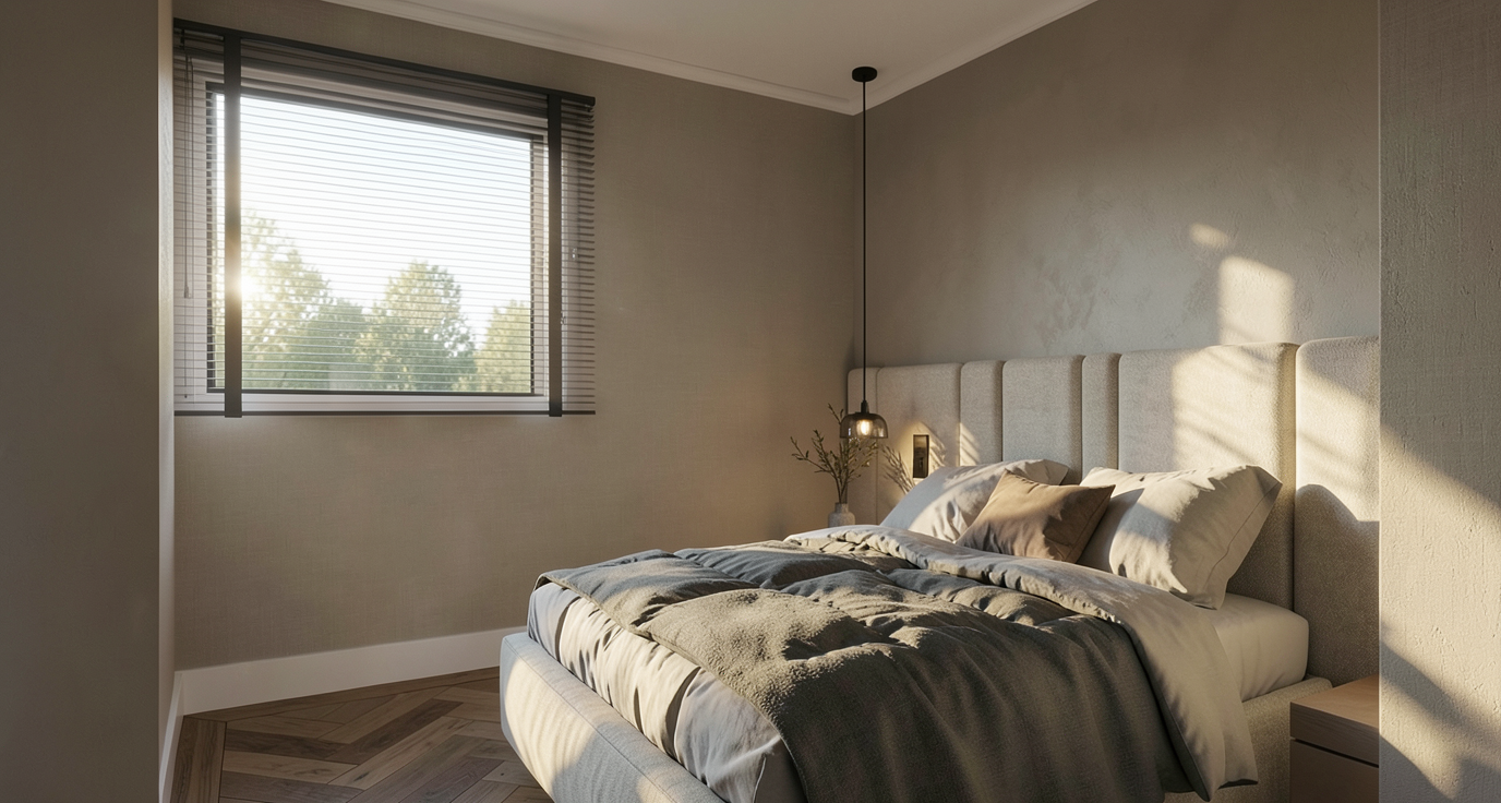 create a realistic high quality interior render with abundant natural daylight the scene should be illuminated by bright warm sunlight entering through windows the lighting should feel soft yet vibrant creating natural shadows and a fresh daytime atmosphere outside the windows include a lush green view with trees and foliage suggesting a sunny day in spring or summer the greenery should appear vivid and slightly sunlit enhancing the connection between the interior and nature the overall mood should feel airy calm and inviting with clear daylight tones and realistic light reflections on surfaces avoid artificial lighting dominance natural sunlight should be the primary light source there are built in wardrobes opposite do not change the colors or the shapes
