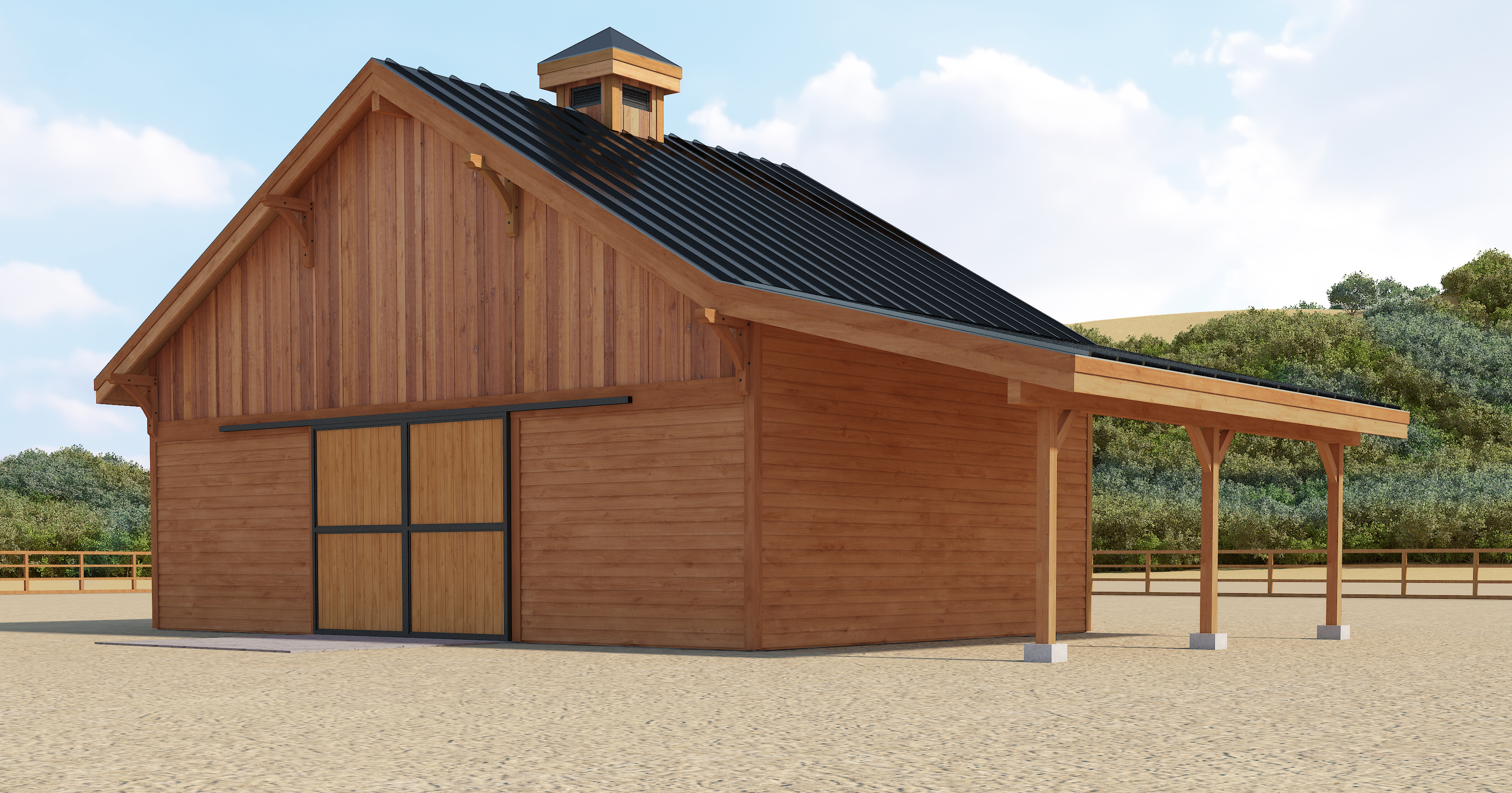 clean timber clad architectural exterior rendered in cinematic bright daylight lighting beautiful clouds in the sky with a hint of blue sky natural cedar wood siding with black trim wood hayloft door with dark trim wood barn doors with black trim black metal standing seam roof grass foreground heavily forest area background lush green and dynamic vegetation landscape natural wood textures high fidelity photorealistic visualization crisp shadow falloff refined fa ade geometry richly detailed grain patterns soft atmospheric depth calm minimal landscaping premium architectural photography mood ultra clean composition and materials reduce vibrancy