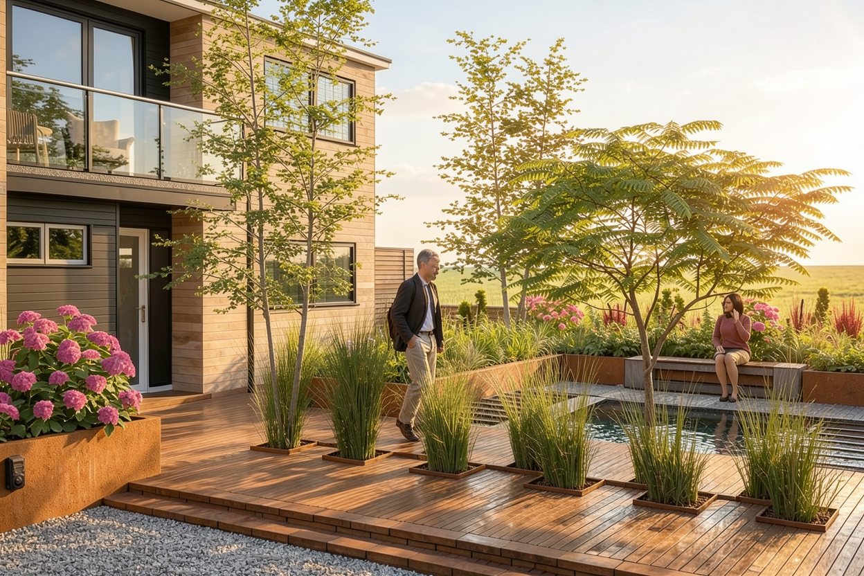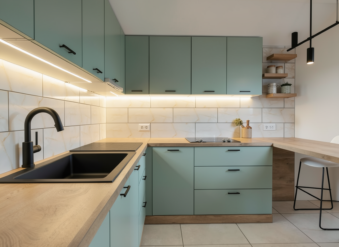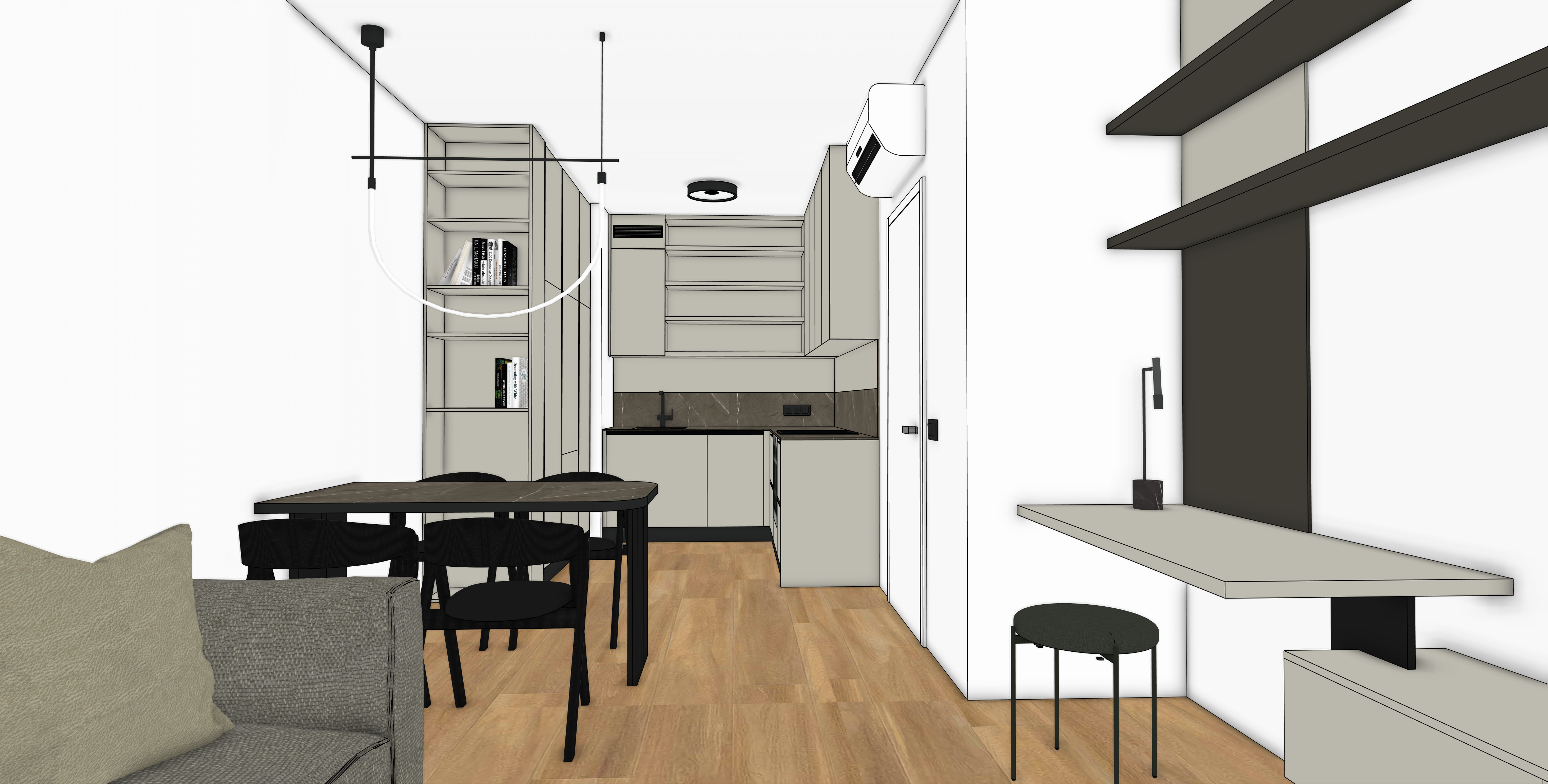render a modern and elegant interior space featuring a compact kitchen and dining area use neutral tones with light beige cabinets and walls complemented by black accents on chairs and fixtures the wooden floor should have a natural light oak color enhancing the warmth of the space include a light gray sofa to add a cozy touch create a minimalist atmosphere with soft natural lighting to emphasize clarity and simplicity ensuring a harmonious and stylish environment
