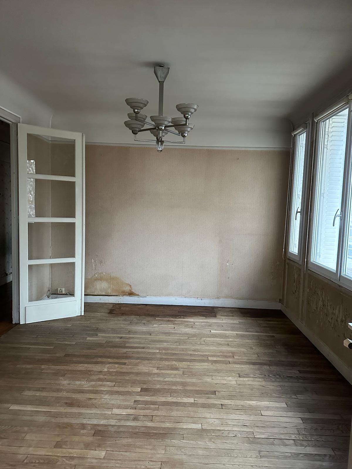exterior shot use the base image layout and proportions transform the space into a warm contemporary kitchen inspired by the reference image kitchen cabinetry made of rich walnut wood with visible natural grain elegant and minimal design with integrated appliances and clean lines important do not add a kitchen island instead place a beautiful dining table in the center of the space with 4 6 chairs creating a kitchen dining area the dining table should complement the walnut cabinetry wood or natural stone table with modern elegant chairs soft natural daylight entering the space warm and calm atmosphere high end architectural visualization realistic materials soft shadows interior photography style ultra realistic render 35mm lens editorial architecture magazine look keep the same parquet of the base picture i want the lower cabinet in wood