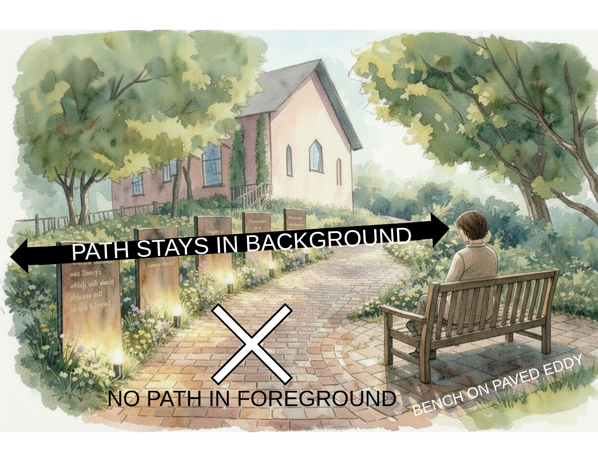 generate a watercolor style illustration using this annotated image as a strict layout guide follow all marked arrows and constraints exactly the brick path must remain entirely in the background running left to right as indicated and must not enter the foreground the bench must sit on a widened paved eddy that is part of the same continuous brick surface as the path do not create isolated paving islands loops or foreground paths preserve the memorial markers along the path and the contemplative garden atmosphere improve watercolor texture light and planting softness without altering circulation depth or layout