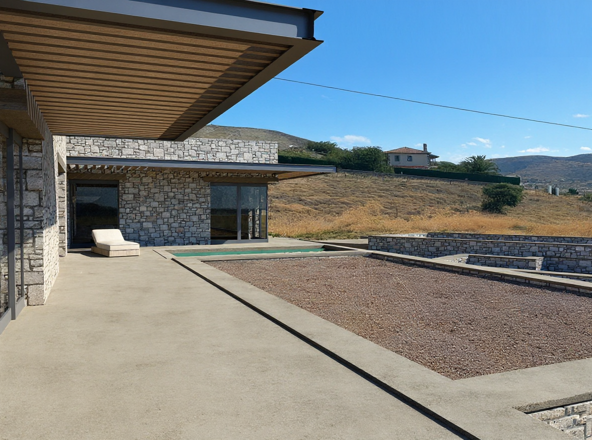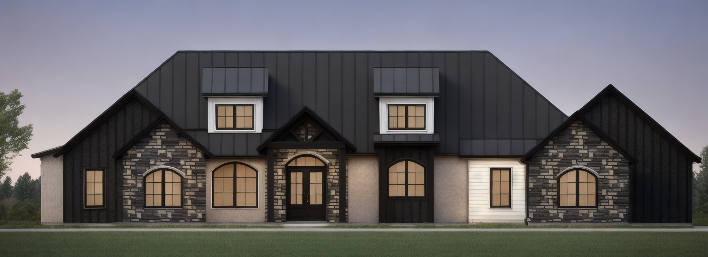 render a beautiful modern two story house with a mix of styles the upper sections feature vertical white wooden paneling contrasting with a lower section of classic white brick the roof is a chic dark gray shingle large windows with black frames provide a view inside ensure the entrance door is a bold charcoal color surround the house with a well maintained lush landscaping under a clear blue sky casting soft and pleasant shadows the atmosphere is calm and inviting perfect for a serene residential setting