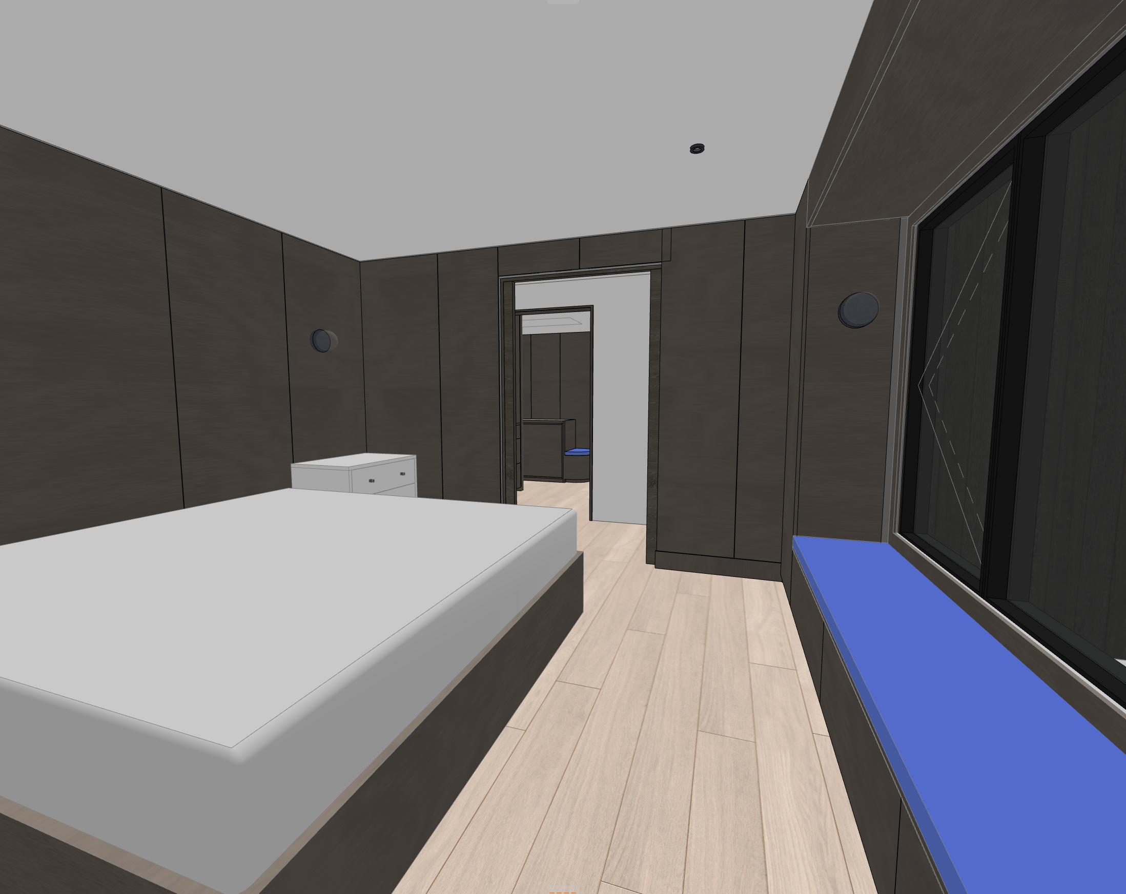 use whitewash oak for the wall paneling and cabinets use navy blue velvet for a window seat cushion show a made bed with white linens show the ceiling as white plaster