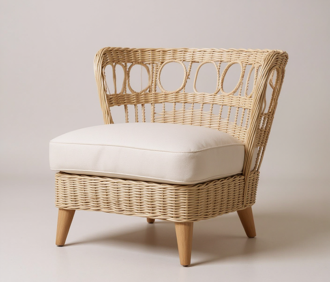 back portion in light powder ivory rattan weaving finish upholstered white seat and back with v hole design back