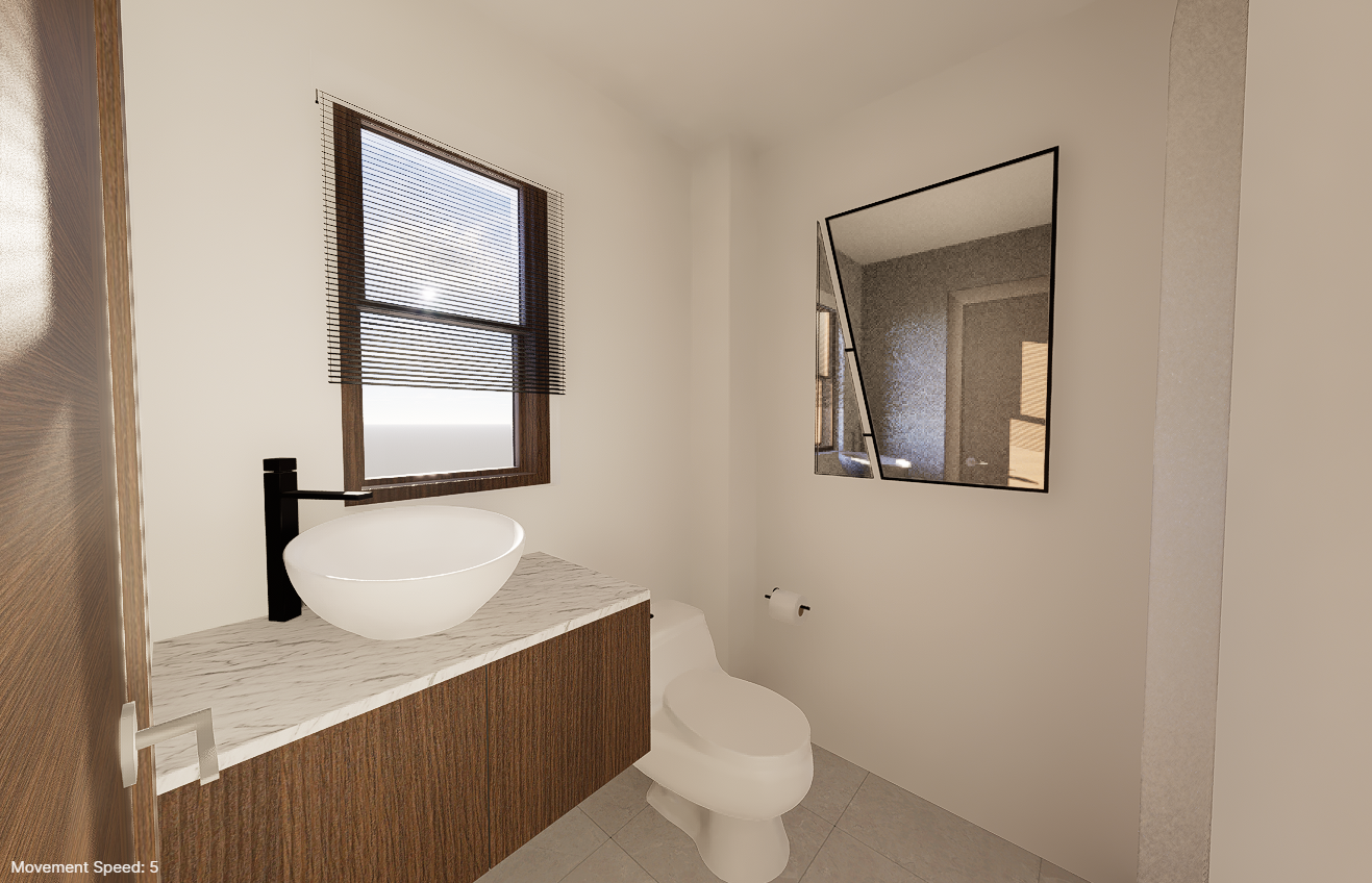 make this simple render of my bathroom look more realistic and high quality i want to have a nice modern mirrow with warm backlit led lighting behind it i want the walls to be a warm cram colour with oak skirtings to match the oak window and the floor to be warm tiles