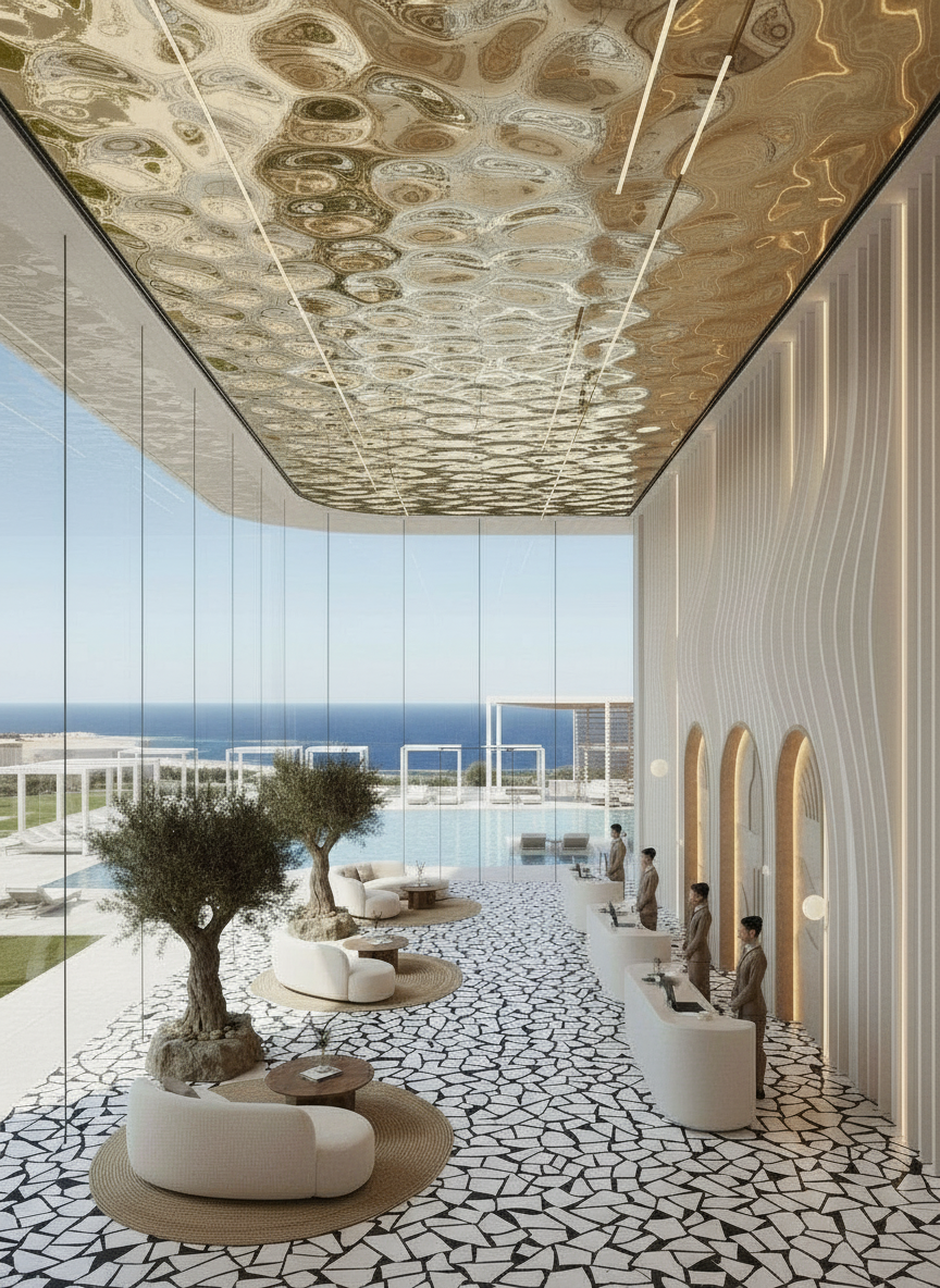 at the reception he used more realistic people and better baptism all women except one don t be like dolls though outside the landscape that is seen put it exactly the other way around with the sea looking deep but from the left side of the picture our outside from the window and from the other direction roofs from the pergolas are visible sanna pome he reversed the landscape on himself as if you were mirroring it attention in take exatly the same image but only make lower the height of this lobby that is a smaller distance between floor and ceiling the rest remains completely the same but reduced by a quarter 1 4 under the same floor but i m doing a slightly smaller scale meaning there are a little more joints a 20 smaller section and the existing joint that looks dark like charcoal gray should be made a little lighter a little more gray the men at the reception make the female figures more realistic not like fake dolls