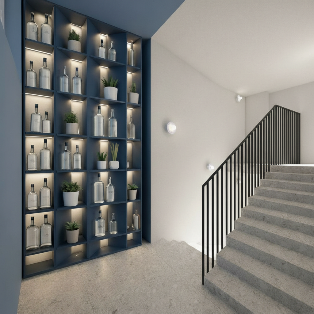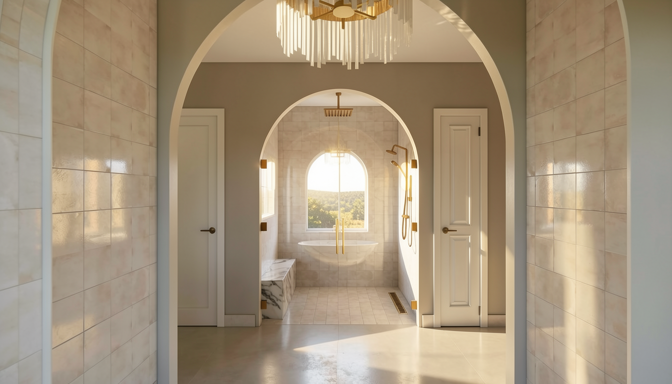 a modern curved reception desk with a luxurious design featuring a honed taj mahal quartzite countertop in soft white with subtle grey veining the front is adorned with a rich textured bronze panel exuding elegance and warmth inset behind the bronze desk panel is honed taj mahal quartzite the desk is set against a wall of smooth off white vertical panels and features a flagstone stone column on the side with irregular natural gray stones the atmosphere is one of sophistication and modernity with minimalistic elements and soft ambient lighting highlighting the textures and colors through the picture windows you see a luscious golf course on a warm summer day