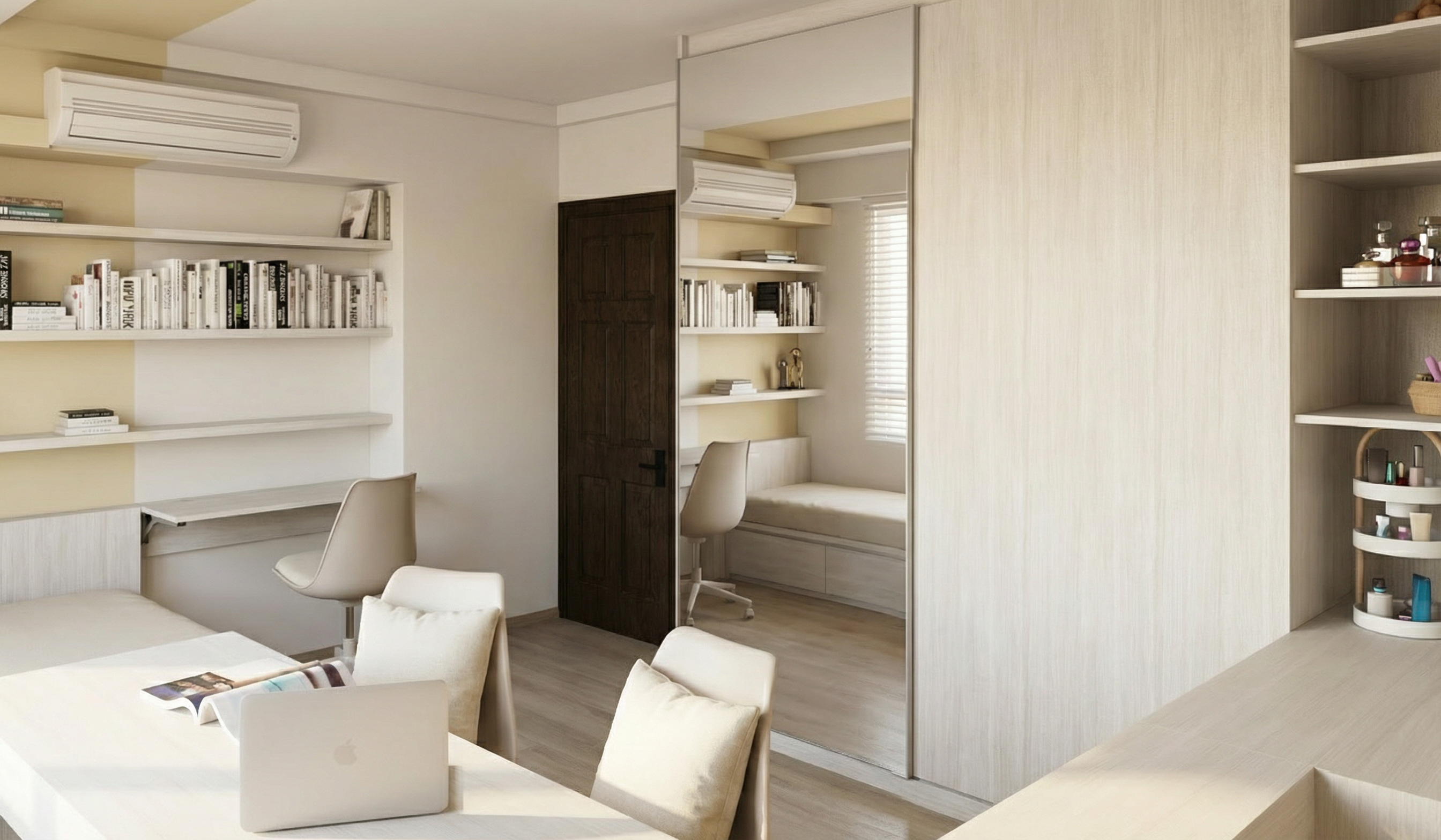 colours and texture to remain accurate as per given picture floor in light beige brown vinyl wood texture subtle carpentry in cream white with subtle wood grains counter surface in cream white with subtle wood grains left sliding door in mirror flip up table below suspended shelving chair in off white two half walls in muted pale yellow other walls in off white no sunlight