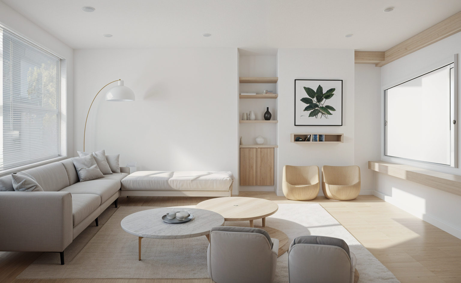 render a modern building facade with striking geometric designs and sharp angles emphasize sleek black panels contrasting with smooth white surfaces illuminate these elements with a soft natural light to create subtle shadows adding depth and dimension the atmosphere should be bright and airy capturing the essence of contemporary architecture against a clear blue sky windows frames plants and peolple