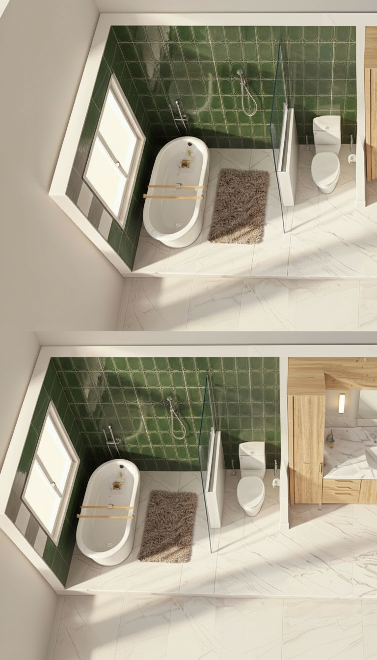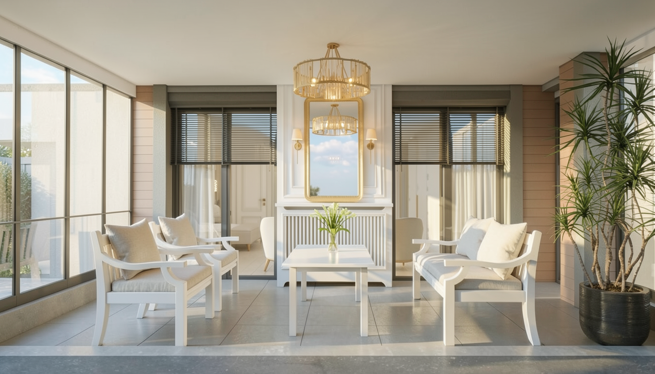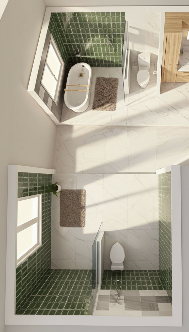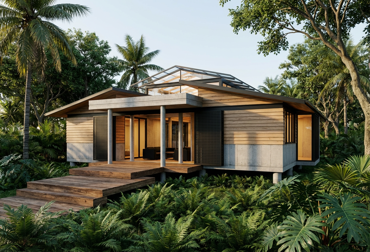 contemporary tropical house with a minimalist design featuring natural wood cladding exposed concrete base and matte black architectural elements the structure includes a fully transparent glass upper roof allowing abundant natural light into the interior the fa ade showcases large floor to ceiling sliding glass doors and a spacious wooden terrace replace structural supports with sleek round black columns creating a refined and modern contrast against the warm wood and concrete textures instead of steps design a continuous full length covered porch portico at the same level with a seamless transition between interior and exterior spaces emphasizing accessibility and clean horizontal lines the house is surrounded by lush tropical vegetation including palm trees dense greenery and large leaf plants like monstera and ferns soft natural lighting warm interior glow strong indoor outdoor connection highly detailed materials ultra realistic architectural render 4k cinematic composition