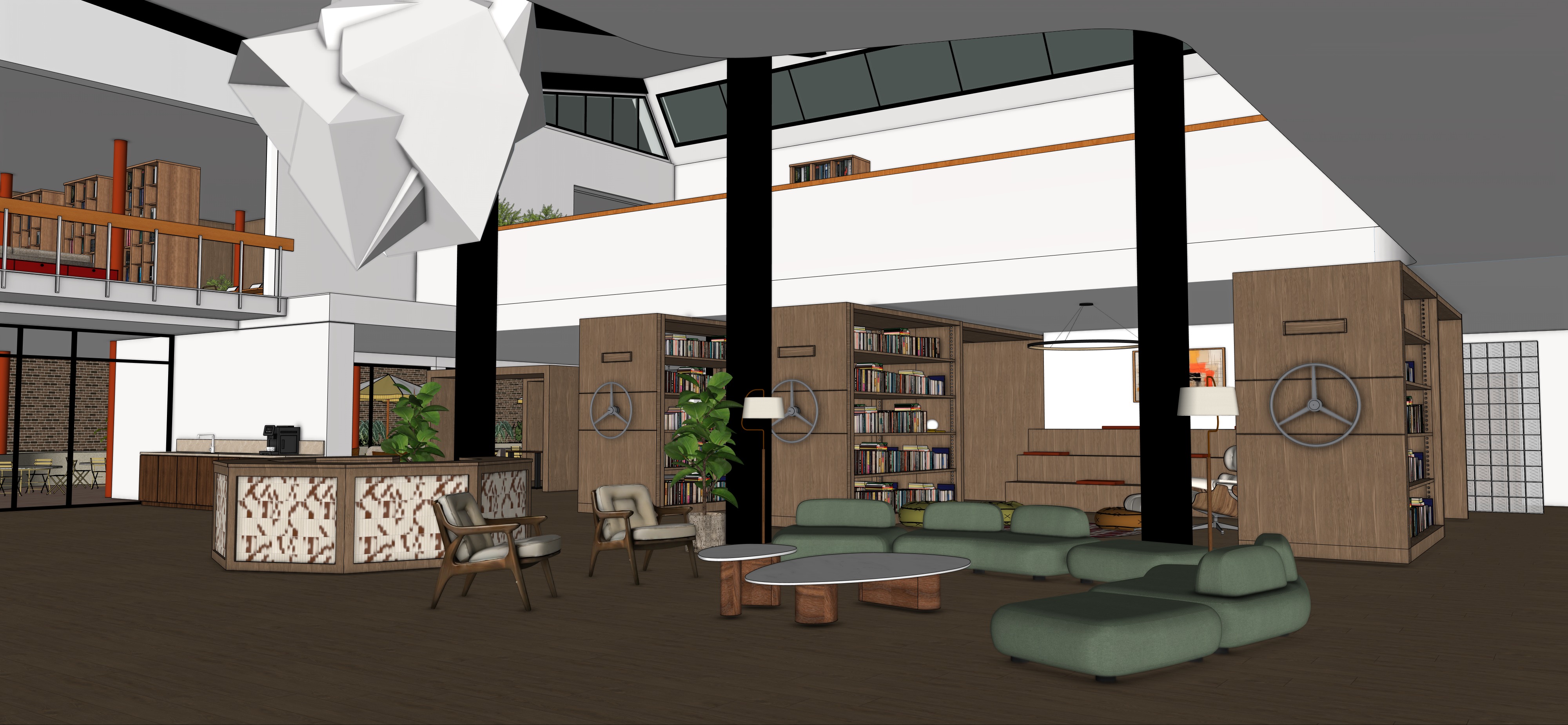 preserve the original sketchup architecture exactly as modeled do not modify geometry layout materials or lighting conditions maintain mediterranean midday natural daylight in barcelona with warm neutral tones and soft skylight diffusion add more people naturally distributed throughout the coworking space to create a lively but calm atmosphere include small groups and individuals performing realistic activities such as sitting and reading on lounge seating working on laptops at tables or seating areas casual conversations between two or three people walking naturally through the space someone browsing books in shelves someone visible on the upper mezzanine level people must feel naturally integrated not posing or looking at camera maintain calm focused creative coworking environment avoid overcrowding scene should feel active but balanced and architectural preserve visibility of architecture and materials mid century modern creative coworking in barcelona mediterranean daylight warm stucco walls wood materials photorealistic architectural visualization editorial architecture photography style