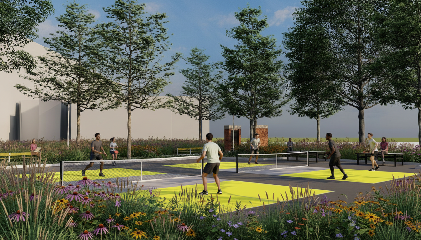 make yellow on court university of iowa gold have students playing pickleball wearing black and gold clothes plant beds shall be native iowa grasses 3 tall don t change area of plant beds