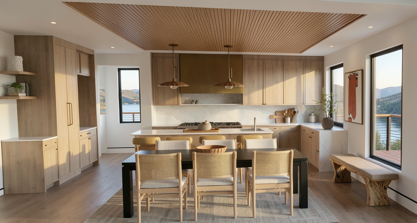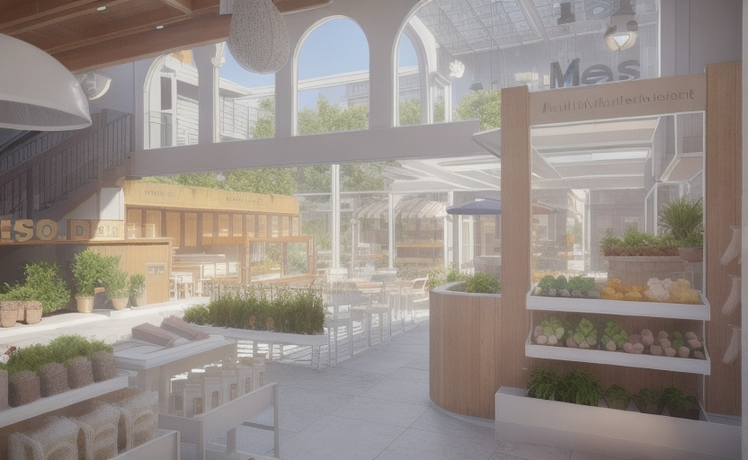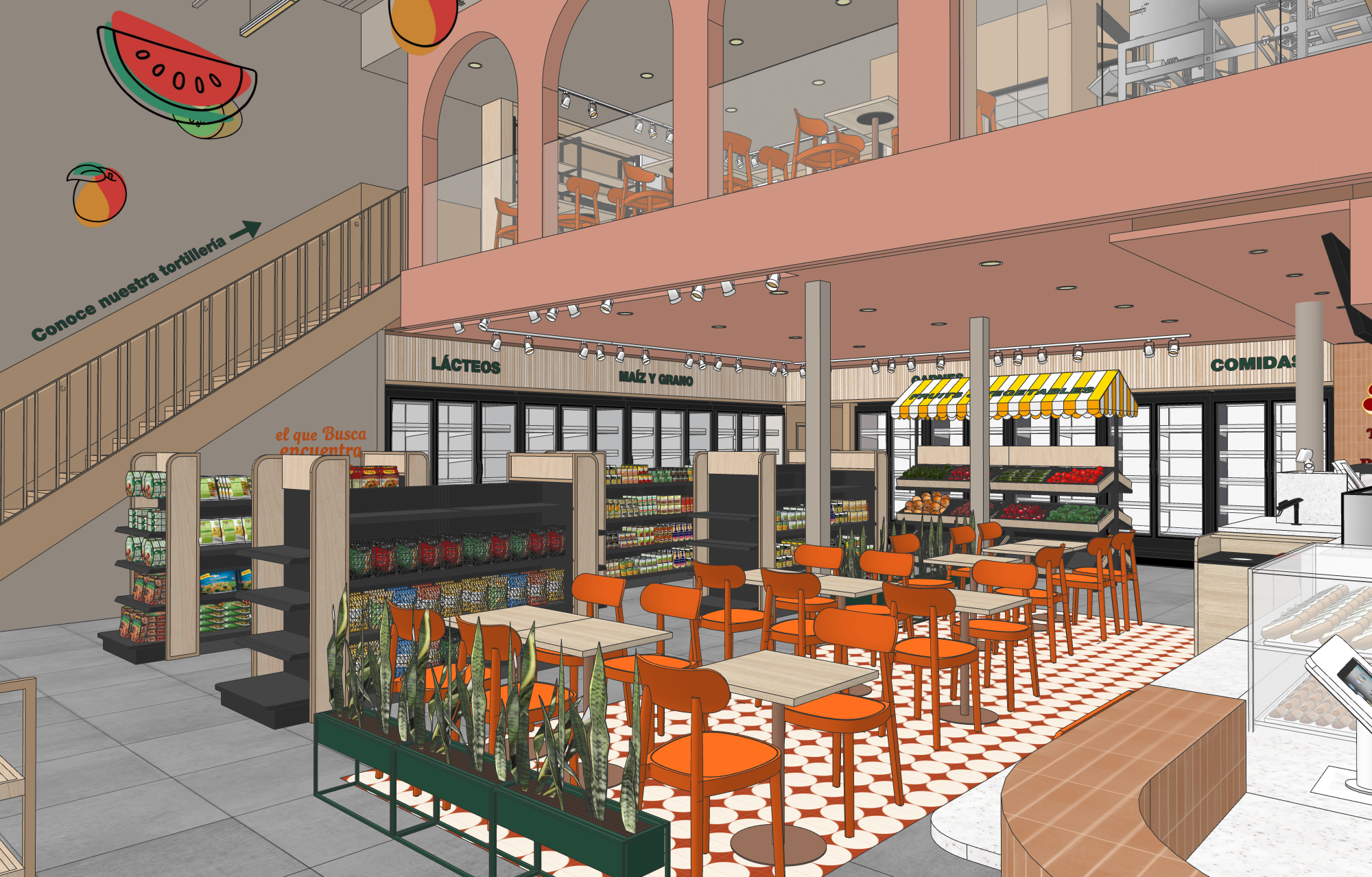 ultra realistic interior architectural render of a local neighborhood supermarket based strictly on the provided reference image maintain exact geometry furniture layout materials textures and original color palette with no artistic reinterpretation warm accent lighting integrated into ceilings signage and display areas combined with a neutral ambient light to balance the space soft realistic shadows accurate light falloff and global illumination fully stocked shelves with realistic grocery products fresh fruits and vegetables packaged foods jars bottles and market goods respecting the original shelving design and proportions people shopping naturally throughout the space customers walking selecting products and browsing shelves one staff member organizing or preparing items behind the juice bar counter realistic materials matte ceramic tiles natural wood finishes painted plaster walls glass metal fixtures all preserved exactly as in the reference clean but lively atmosphere local market feeling everyday realism high detail photorealistic textures correct scale realistic reflections depth of field subtle sharp focus camera at human eye level wide angle interior shot professional architectural visualization quality 4k resolution