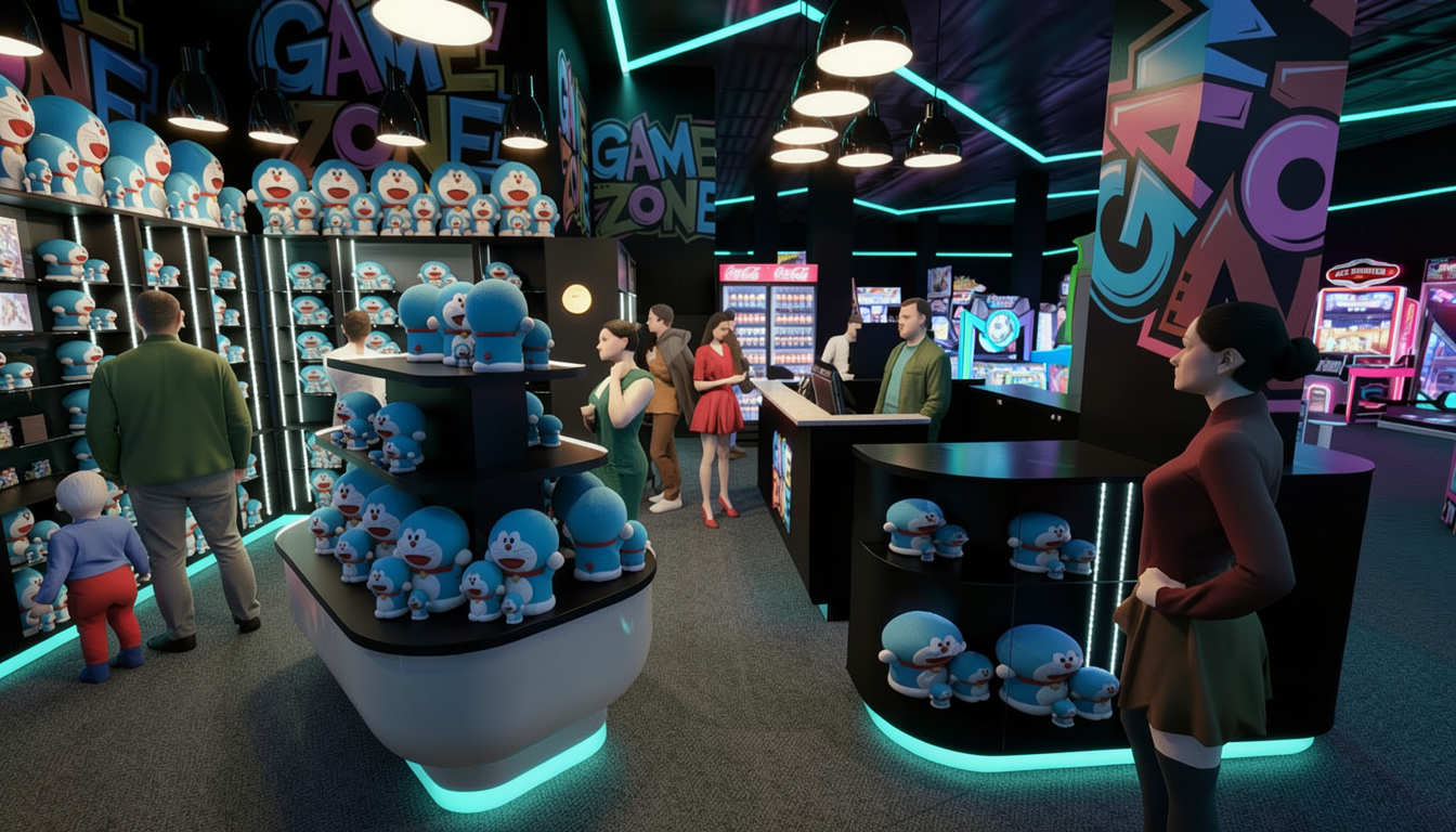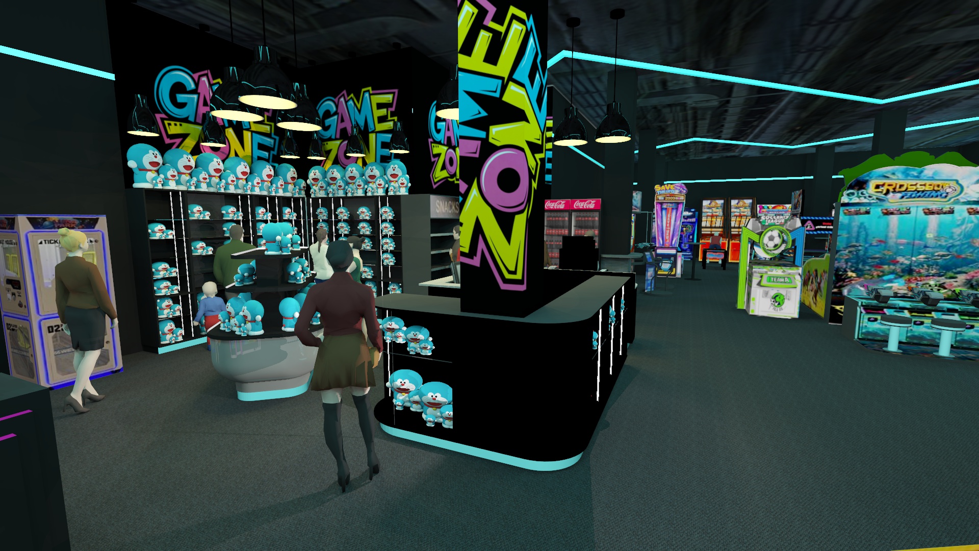 an arcade and gaming hall the machines glow brightly black walls and a black ceiling the floor covered in dark gray carpet turquoise light lines on the ceiling and turquoise lighting under the furniture create a photorealistic effect