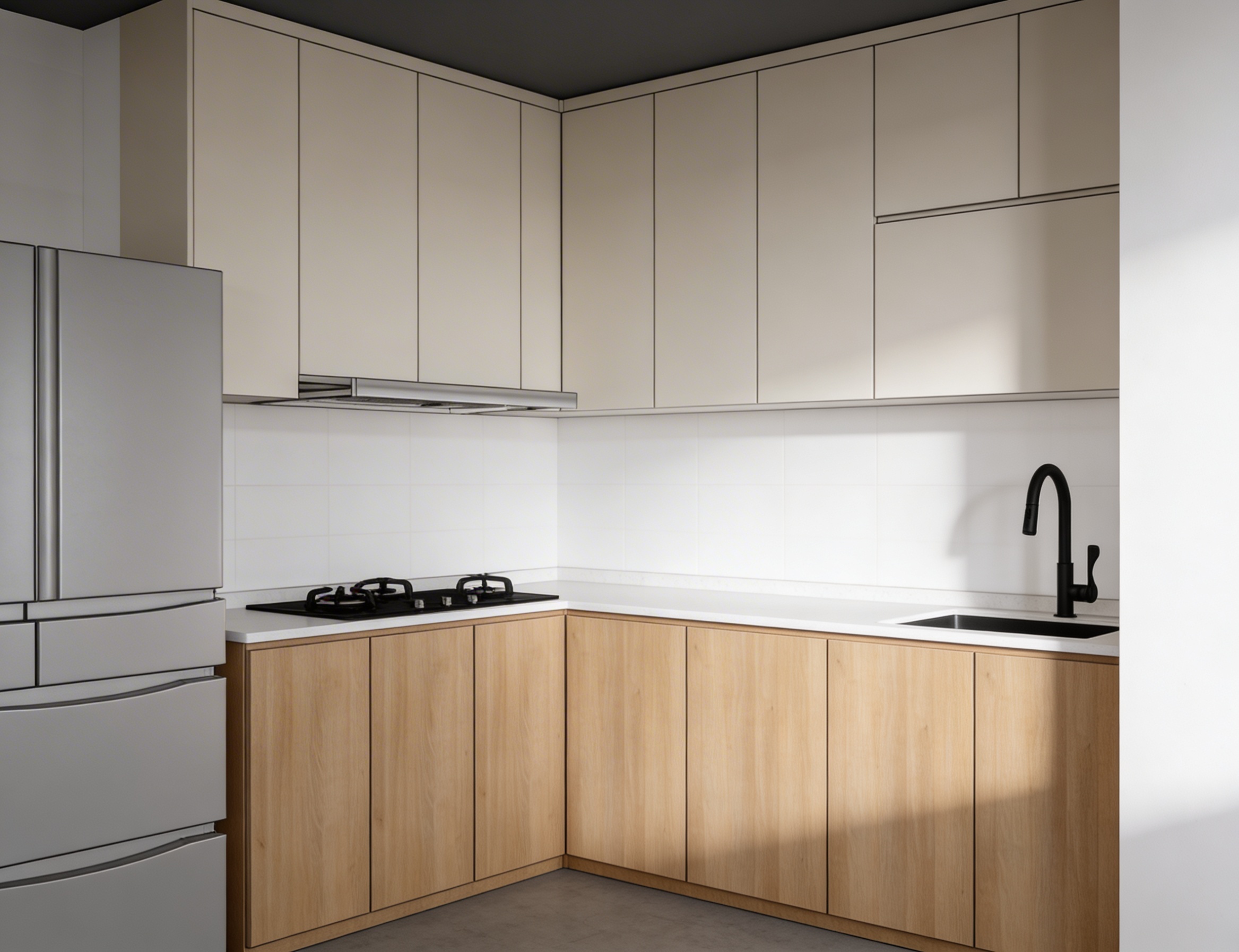 make a photorealistic image with some natural lighting decoration in the cabinet books and vases or something do not change anything in materials only use the existing materials and interior items do not change the spot in the ceiling color gunmetal keep the wood of the cabinet light grey oaked do not change the wallpapers and keep the ceiling light