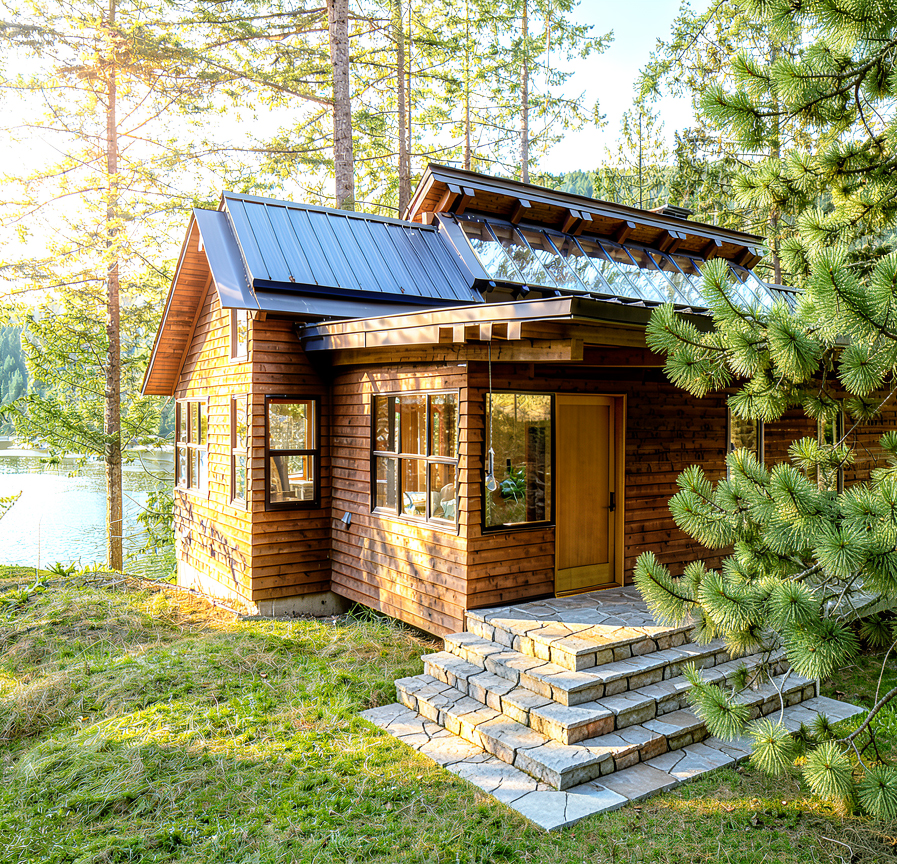 change to dusk with a warm glow from the home but still some light in the forest and the skylights glowing