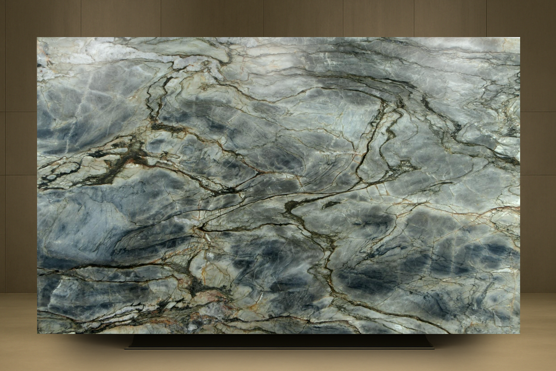 create an outdoor moodboard based around this slab of tempest blue quartzite include terracotta outdoor fabrics wood and stone