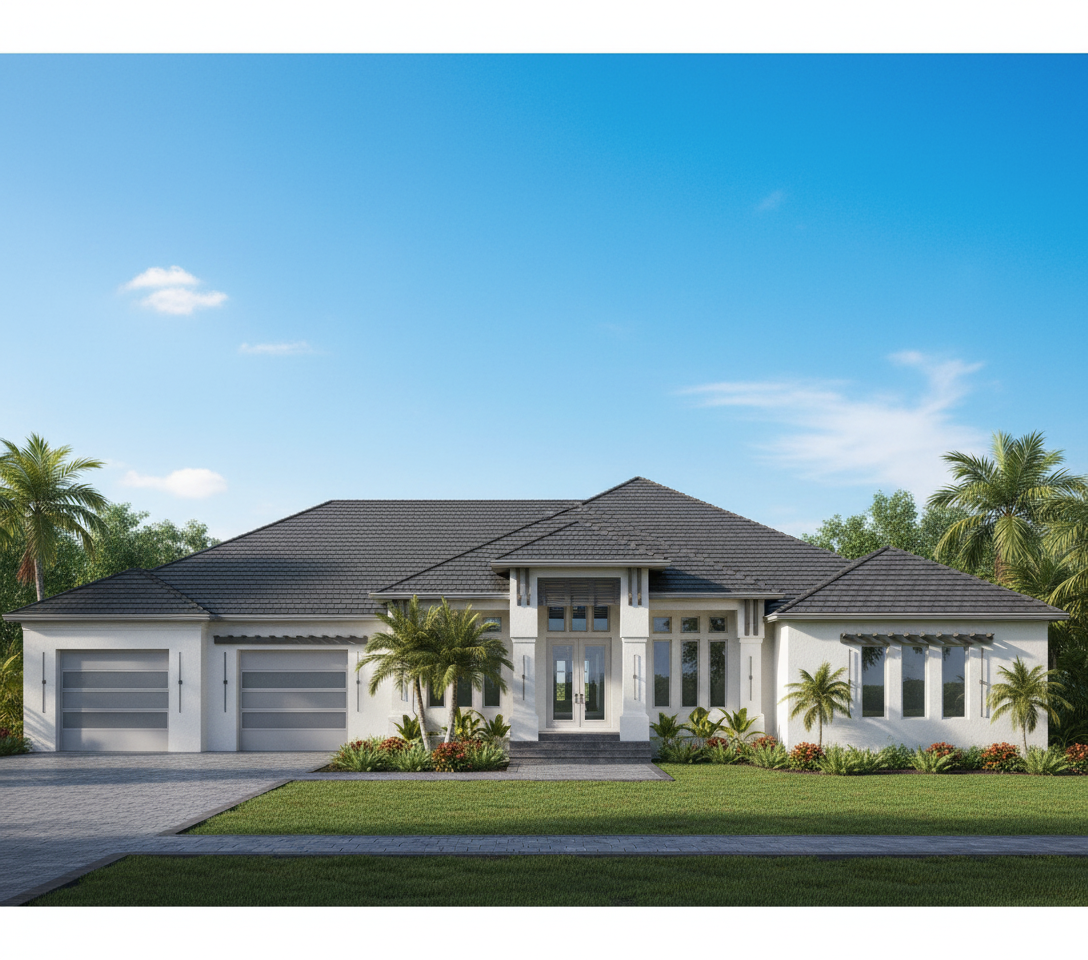 make as photorealistic as possible while keeping textures the same as selection professional landscaping in a lightly wooded scene with good lighting light grey horizontal siding dark roof white windows solid black front door white garage door no stone flat lot