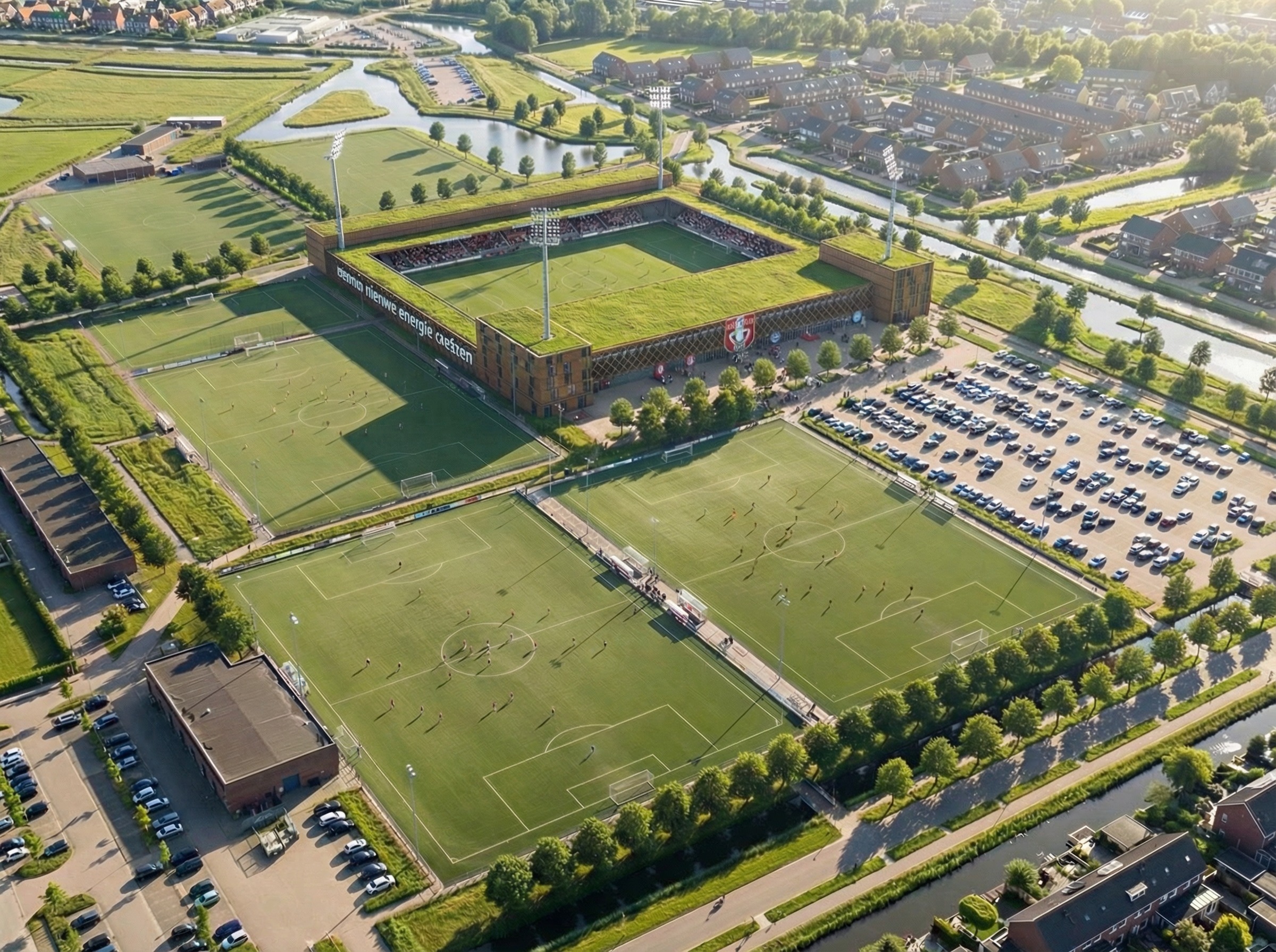 maak van het voetbalveld rechtsonder ook een parkeerplaats voeg daar ook een aantal parkeerplaatsen met een zonnepanelenluifel aan toe verwijder ook het gebouwtje en de parkeerplaatsen linksonder en maak daar een groen parkje van laat de rest precies hetzelfde als het origineel
