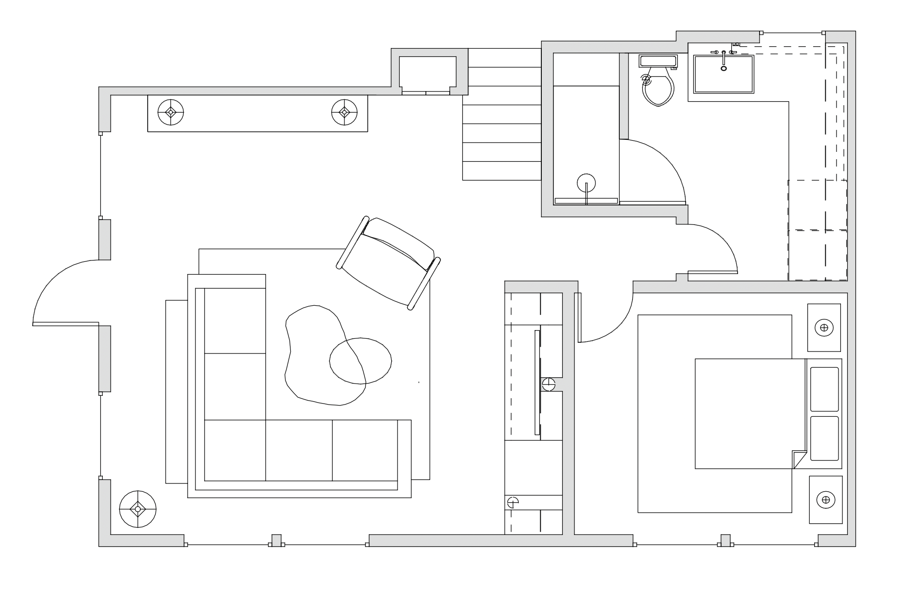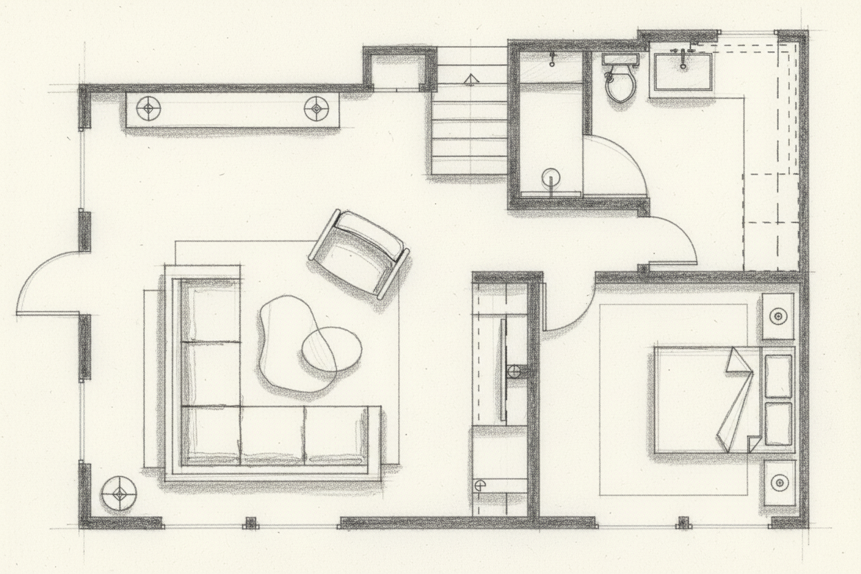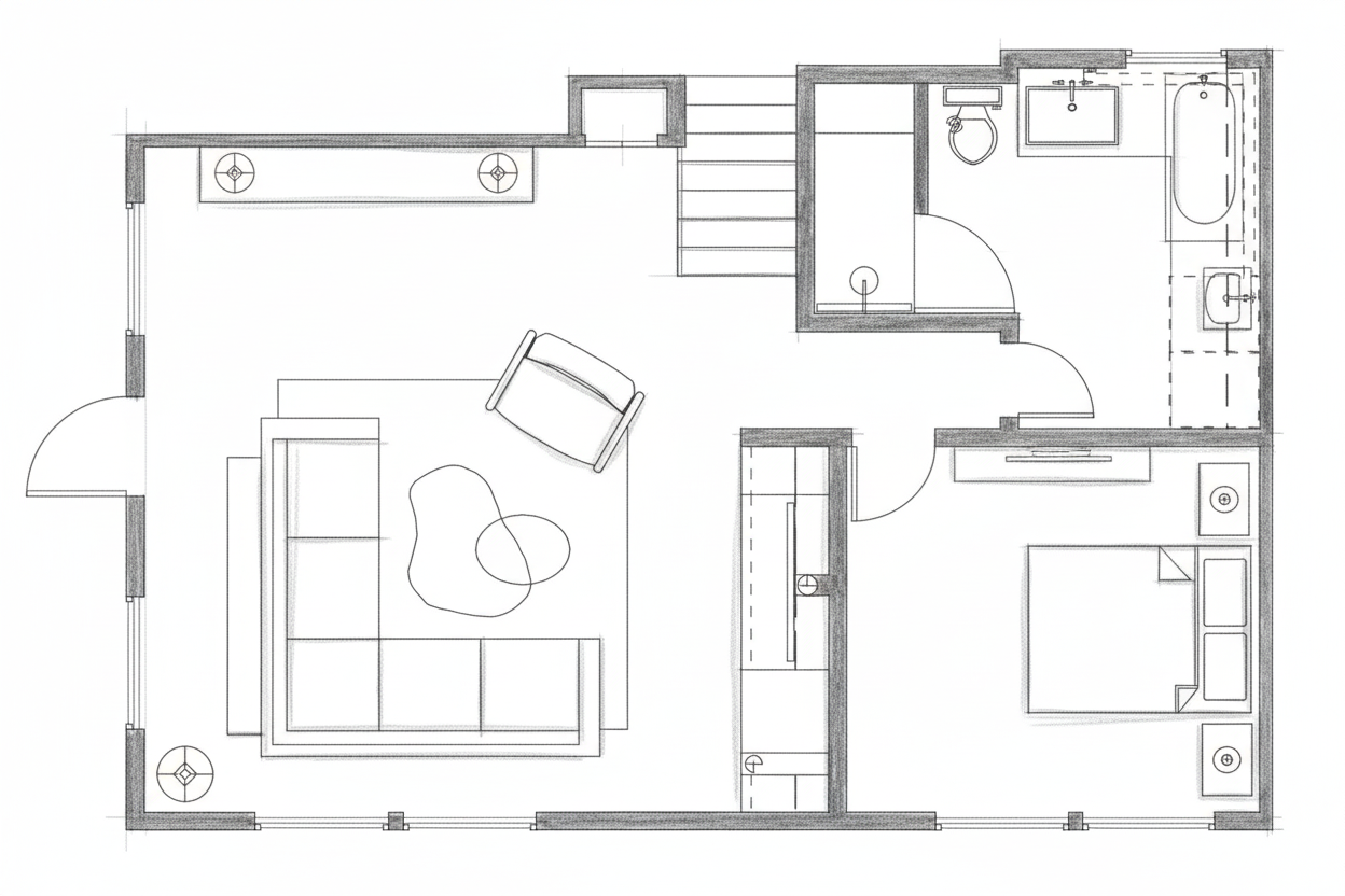 create a floorplan with no structural changes or additions make it exactly this floorplan and change only the style to a sketchy architectural graphite look sketch with some shading and interest do not add any lettering or words make the background pure white