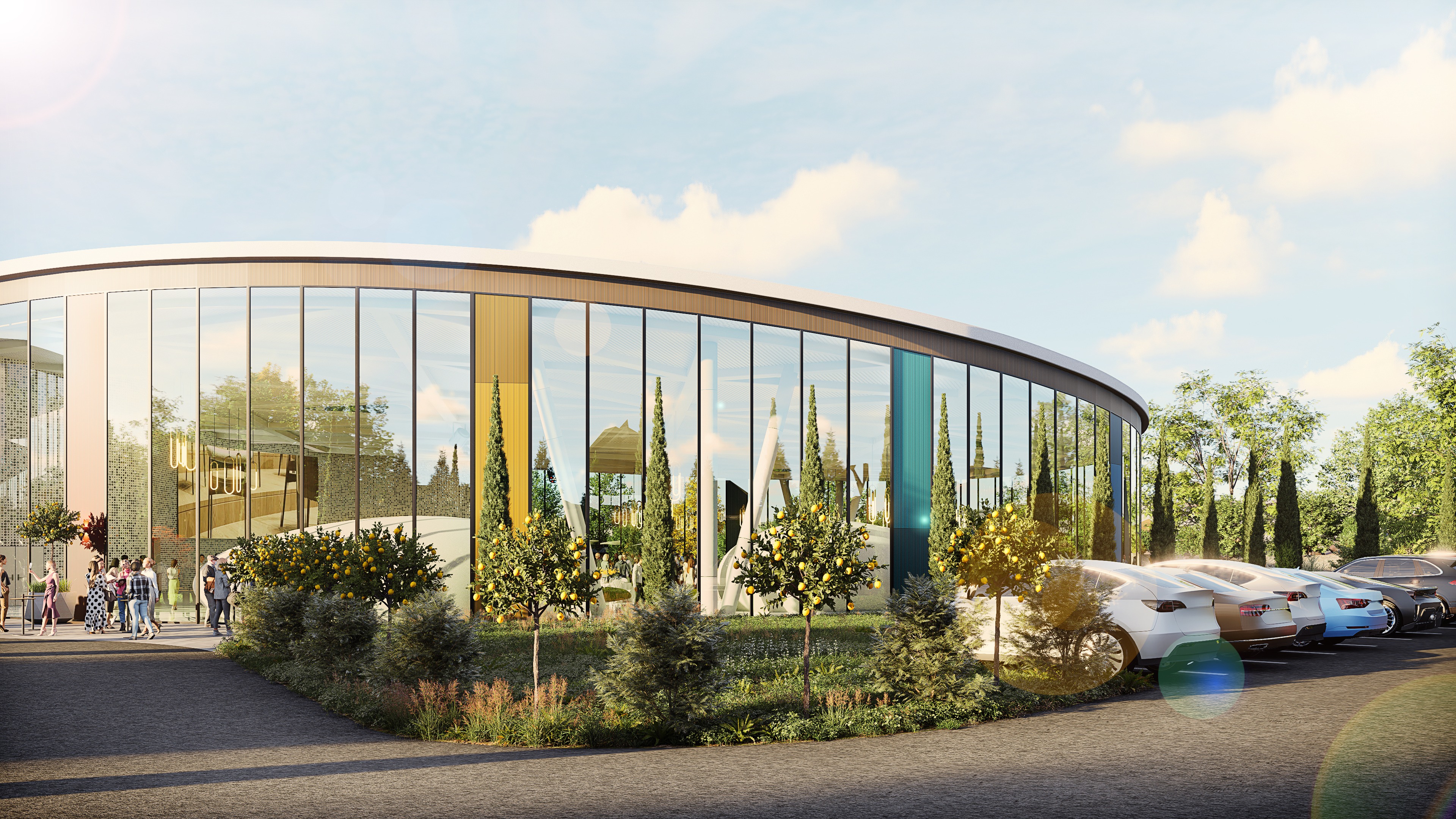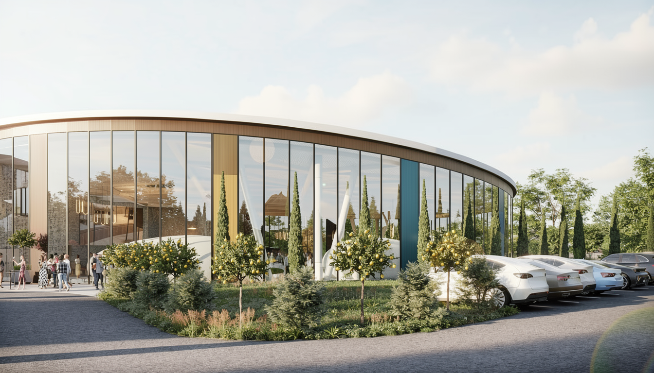 important preserve the existing geometry and the existing context exactly as provided preserve the existing windows do not add new windows do not modify alter reinterpret add remove scale or reshape any geometry do not change the site surroundings street layout neighboring buildings vegetation or context elements do not modify geometry scale proportions buildings road layout sidewalks or surrounding context in any way do not modify text soft noon atmosphere diffused neutral natural daylight with subtle cold tones cinematic architectural mood warm interior lighting 3000k glowing from inside creating strong contrast between cool exterior and warm interior large glass surfaces with realistic reflections soft mirror effect subtle environmental reflections of sky and surroundingsimportant do not add new windows